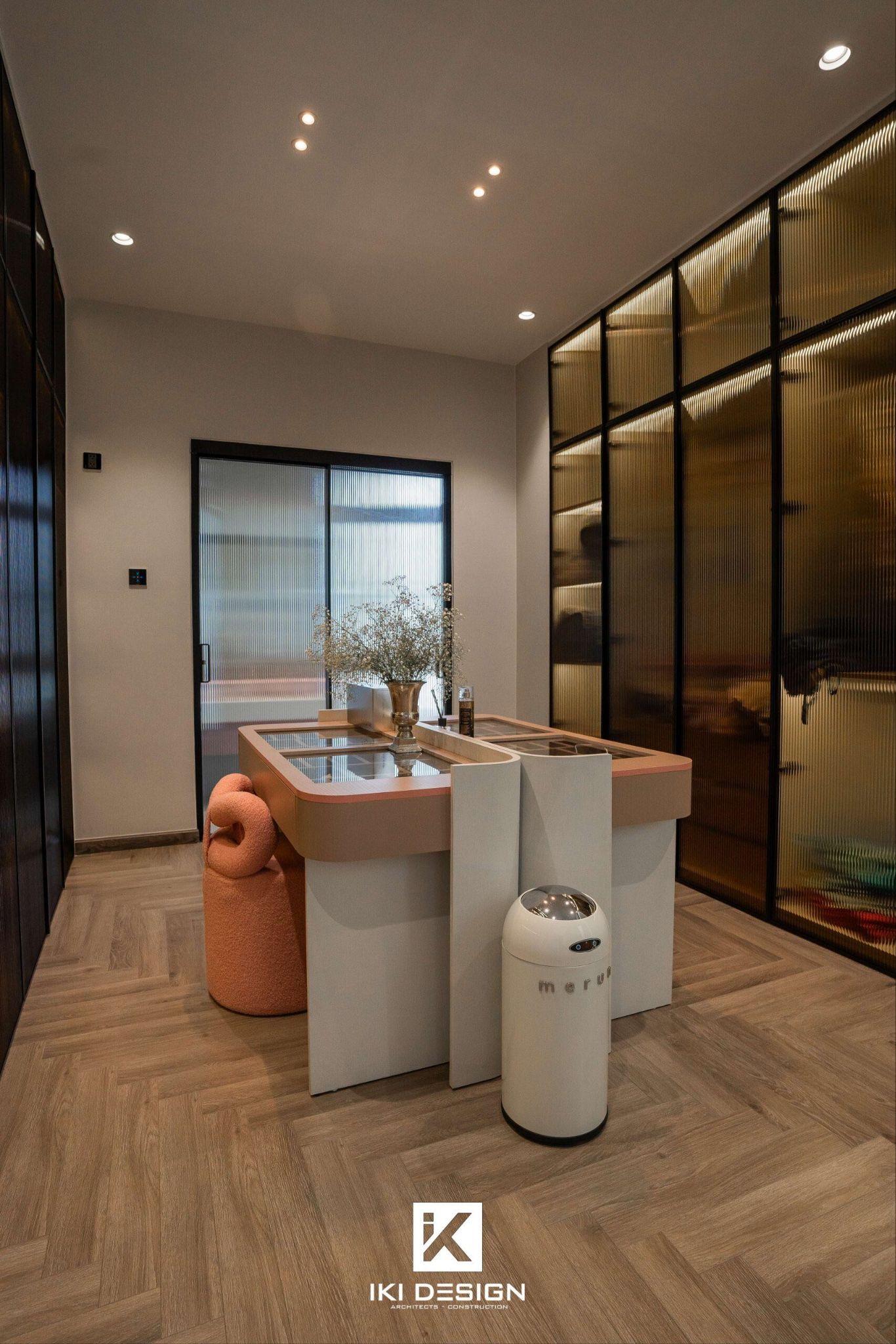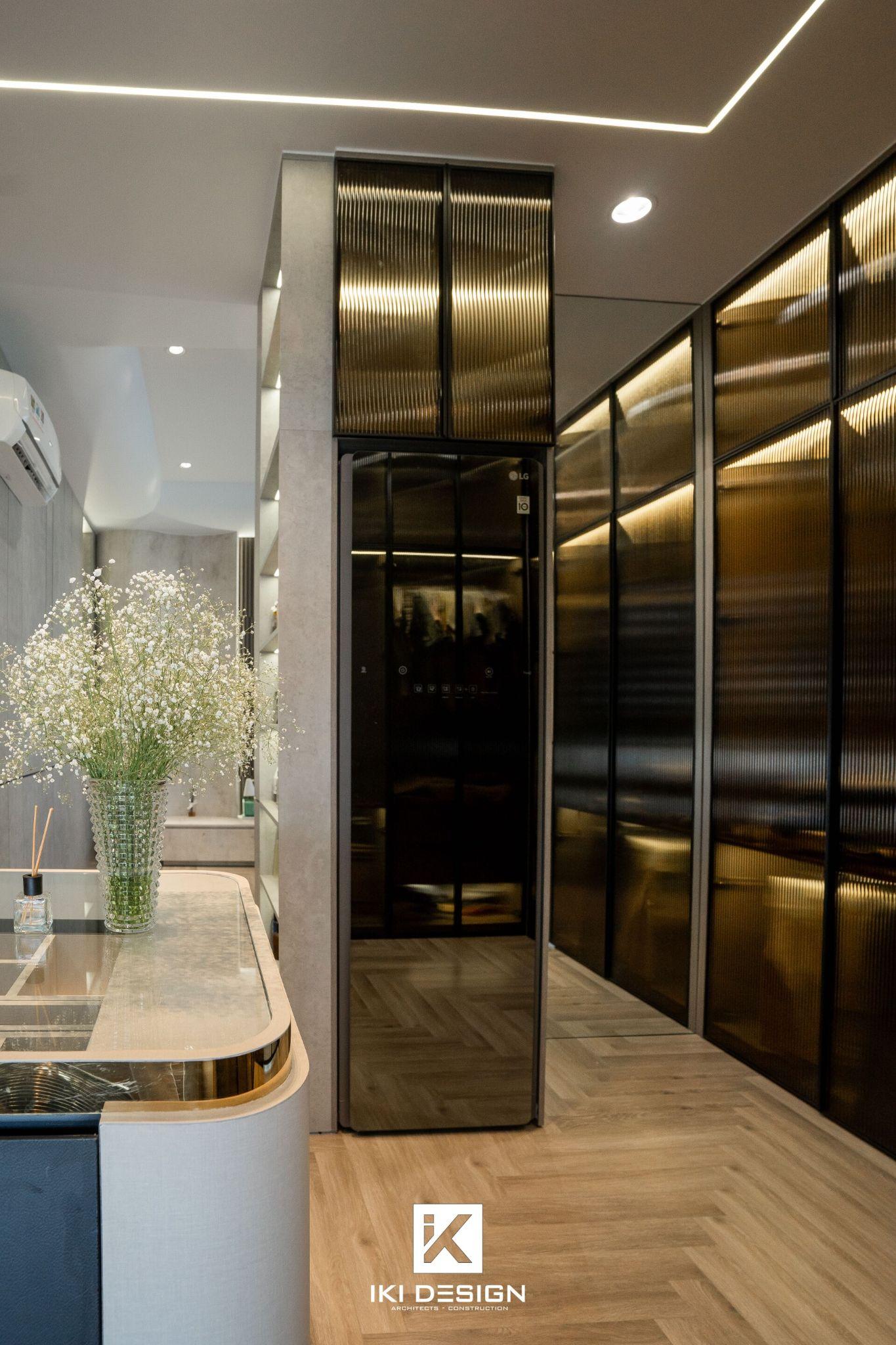 Ngay cạnh phòng ngủ master là khu thay đồ rộng, kết hợp giữa tủ kính mờ ánh đồng và bàn đảo trung tâm. Các mảng tường, tủ và ánh sáng được xử lý tinh tế để không gian vừa sang trọng vừa ấm áp. Cánh tủ sử dụng kính sọc mờ giúp ánh sáng lọt qua nhẹ nhàng mà vẫn đảm bảo kín đáo, trong khi đèn LED chạy dọc hệ tủ tạo chiều sâu thị giác.