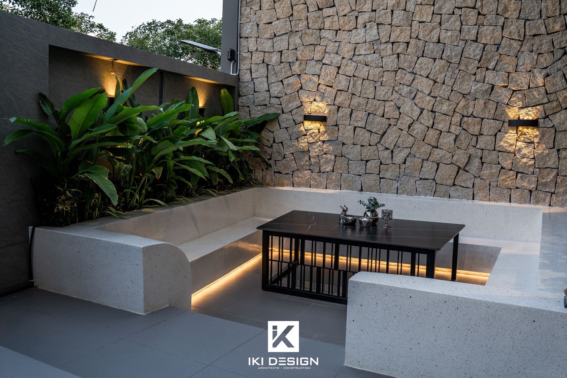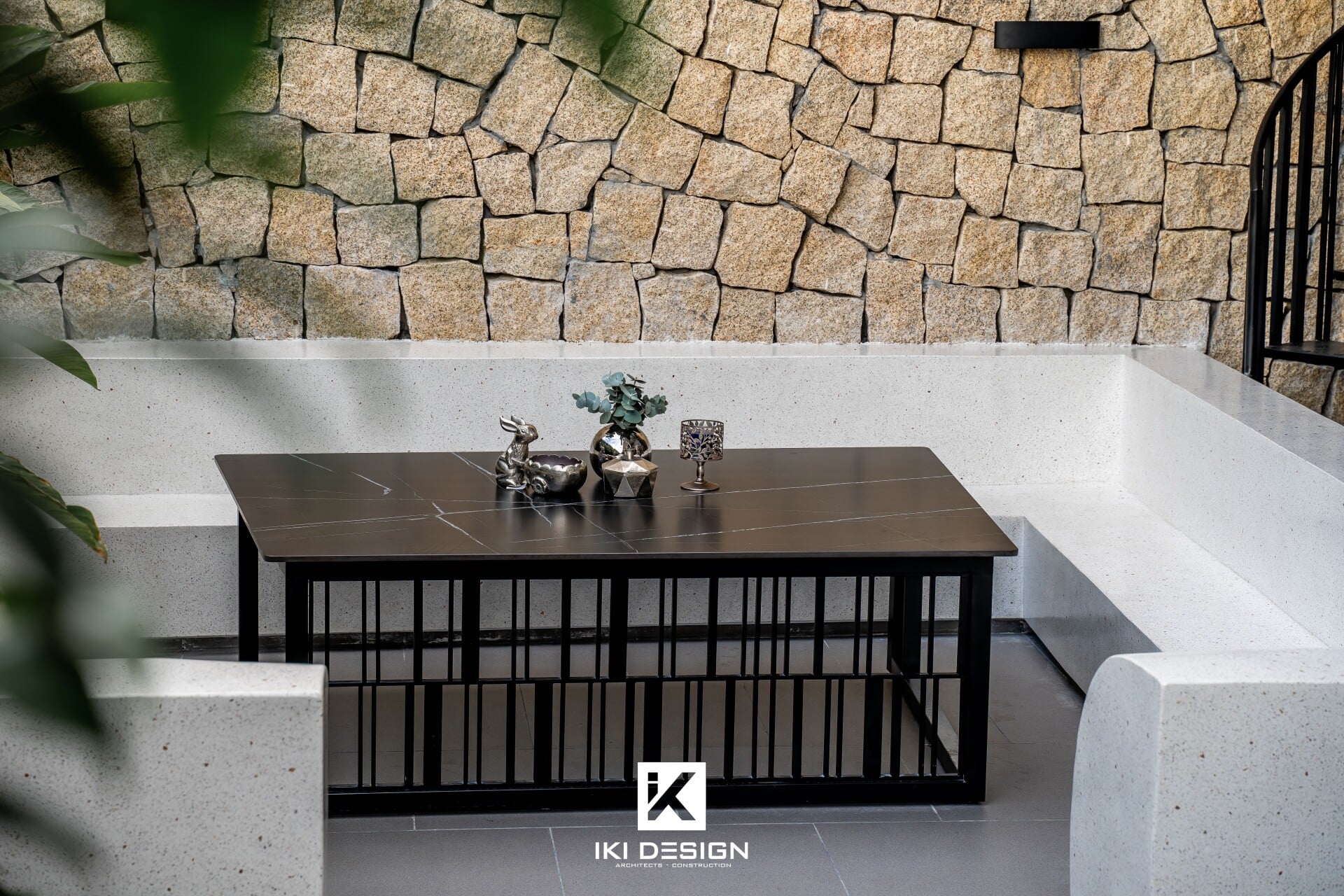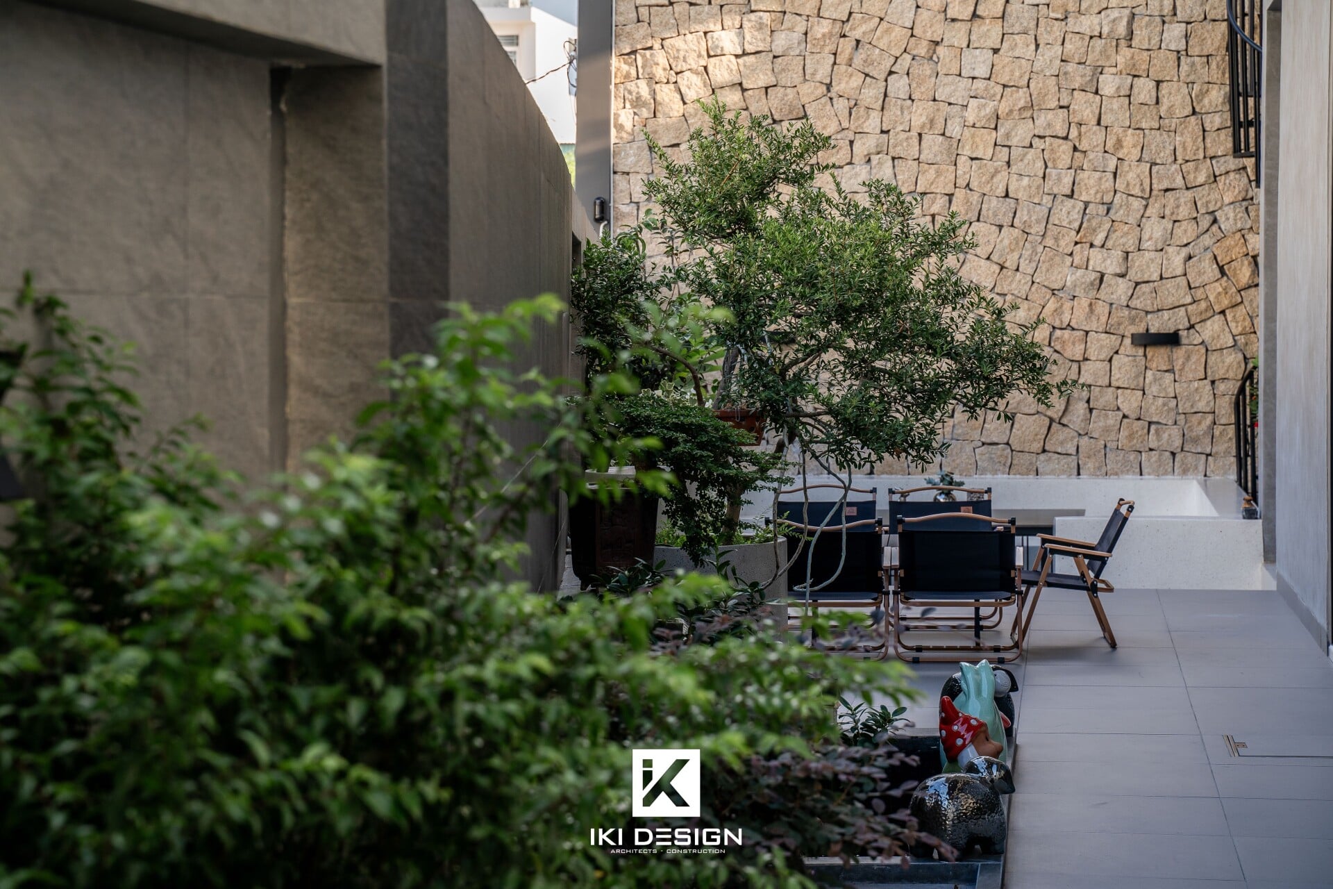 Từ khu sinh hoạt bên trong, lối đi phụ dẫn ra khoảng sân vườn sau nhà – nơi IKI Design bố trí góc ngồi uống trà, tiểu cảnh cây xanh và hồ nước nhỏ. Mảng tường ốp đá khối tự nhiên vừa là phông nền mạnh mẽ vừa mang đến cảm giác gần gũi, chân thực. Khi trời tối, ánh sáng đèn hắt tường và dưới ghế xi măng giúp không gian trở nên ấm cúng, gợi cảm giác nghỉ dưỡng giữa lòng thành phố.