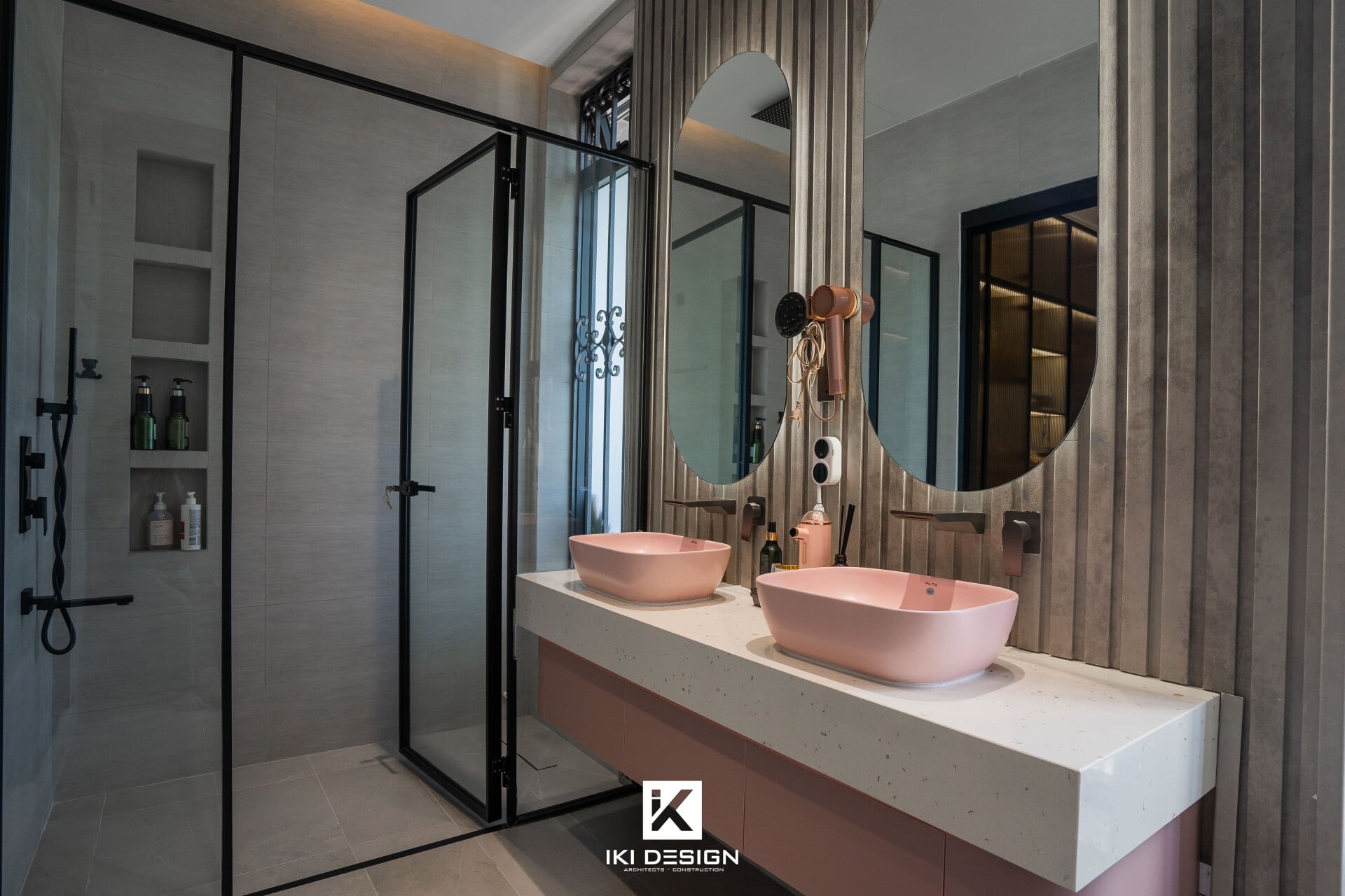 Phòng tắm master nhìn toàn cảnh với vách kính đen chia khu tắm và khu lavabo. Sự kết hợp giữa màu hồng phấn, xám lạnh và ánh sáng tự nhiên tạo không khí nhẹ nhàng, thư giãn.