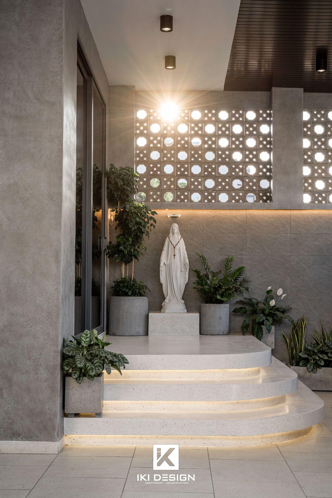 Ngay khi bước qua cổng, người ta cảm nhận được sự tĩnh lặng và mộc mạc. Sân đệm được bao quanh bởi tường gạch bông gió, cho phép ánh sáng và gió lọt qua tự nhiên. Bậc tam cấp bo cong mềm mại, kết hợp hệ đèn hắt vàng dưới bậc, dẫn lối nhẹ nhàng vào nhà. Cây xanh và tượng đặt trang trọng trong góc, mang đến cảm giác cân bằng và an yên.