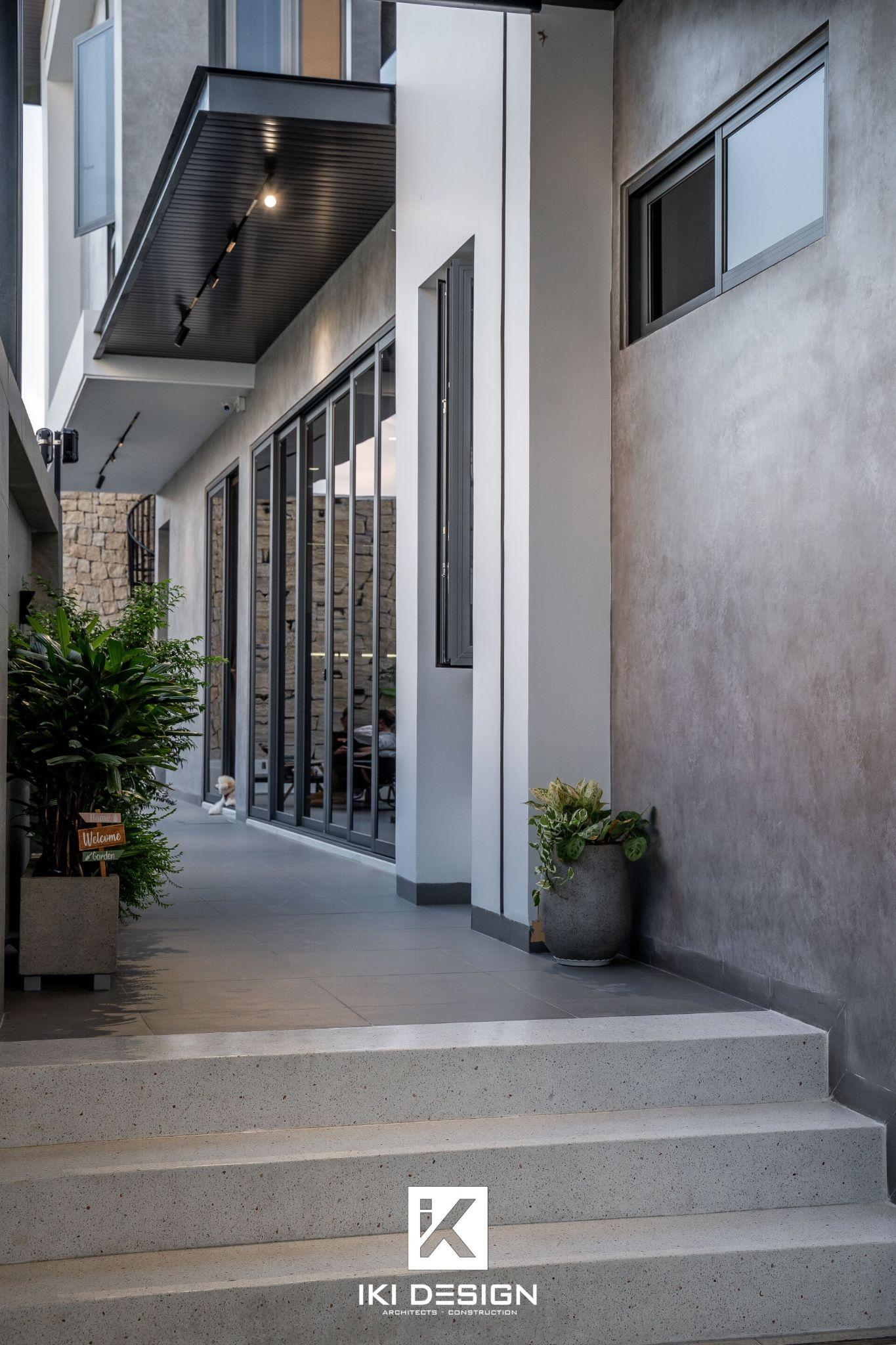 Lối vào phụ kết nối các không gian trong nhà với khu sân vườn phía sau. Tường xi măng xám kết hợp mảng kính lớn và cây xanh dọc lối đi giúp không gian luôn sáng thoáng, hài hòa giữa kiến trúc và thiên nhiên.
