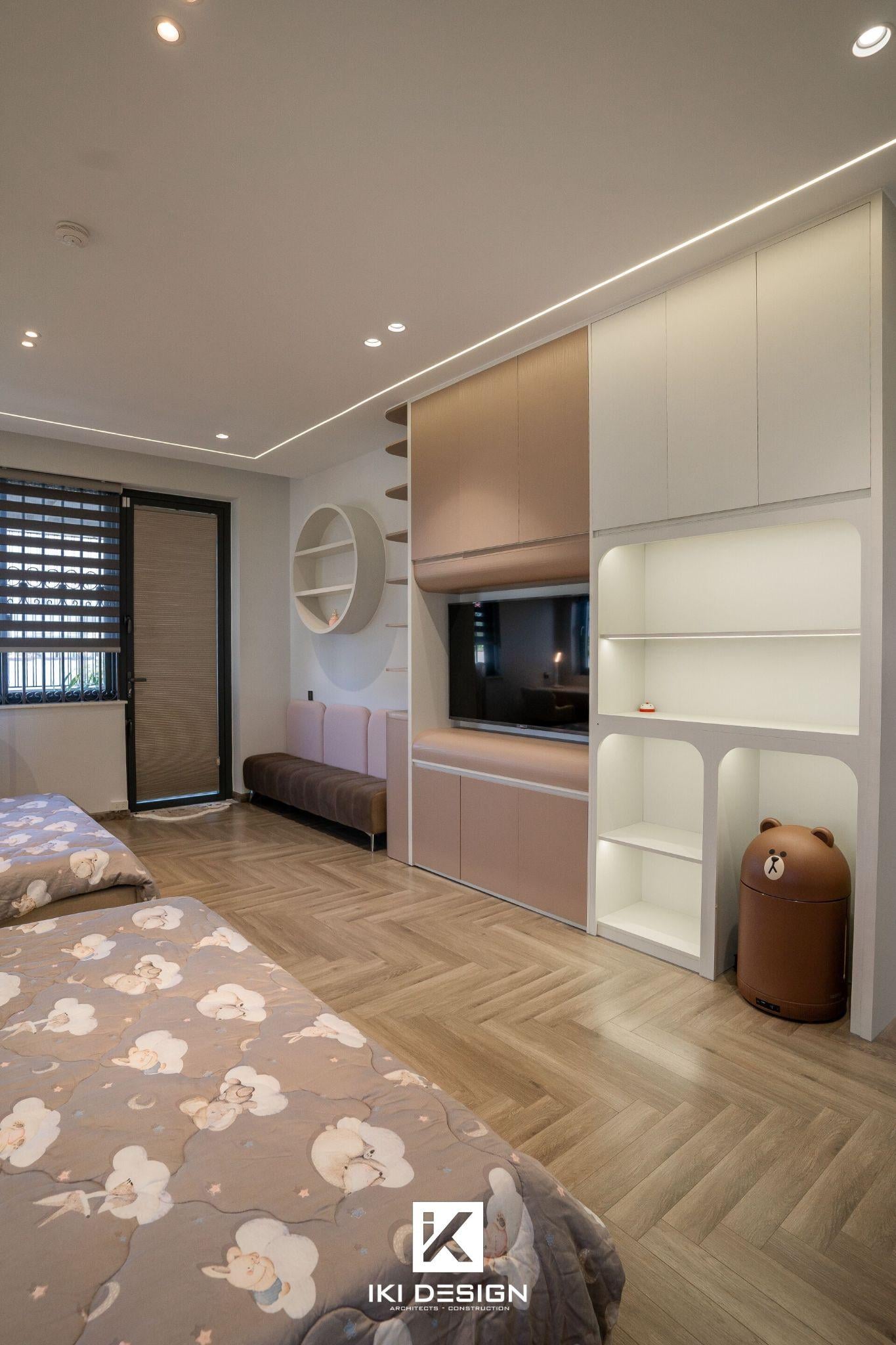 Màu pastel được phối hài hòa với các vật liệu trung tính, tạo không gian nhẹ nhàng nhưng không kém phần sinh động. Ngoài ra, mỗi bé đều có bàn học riêng gần cửa sổ, đón sáng tự nhiên, giúp tăng khả năng tập trung và thị giác thoải mái.