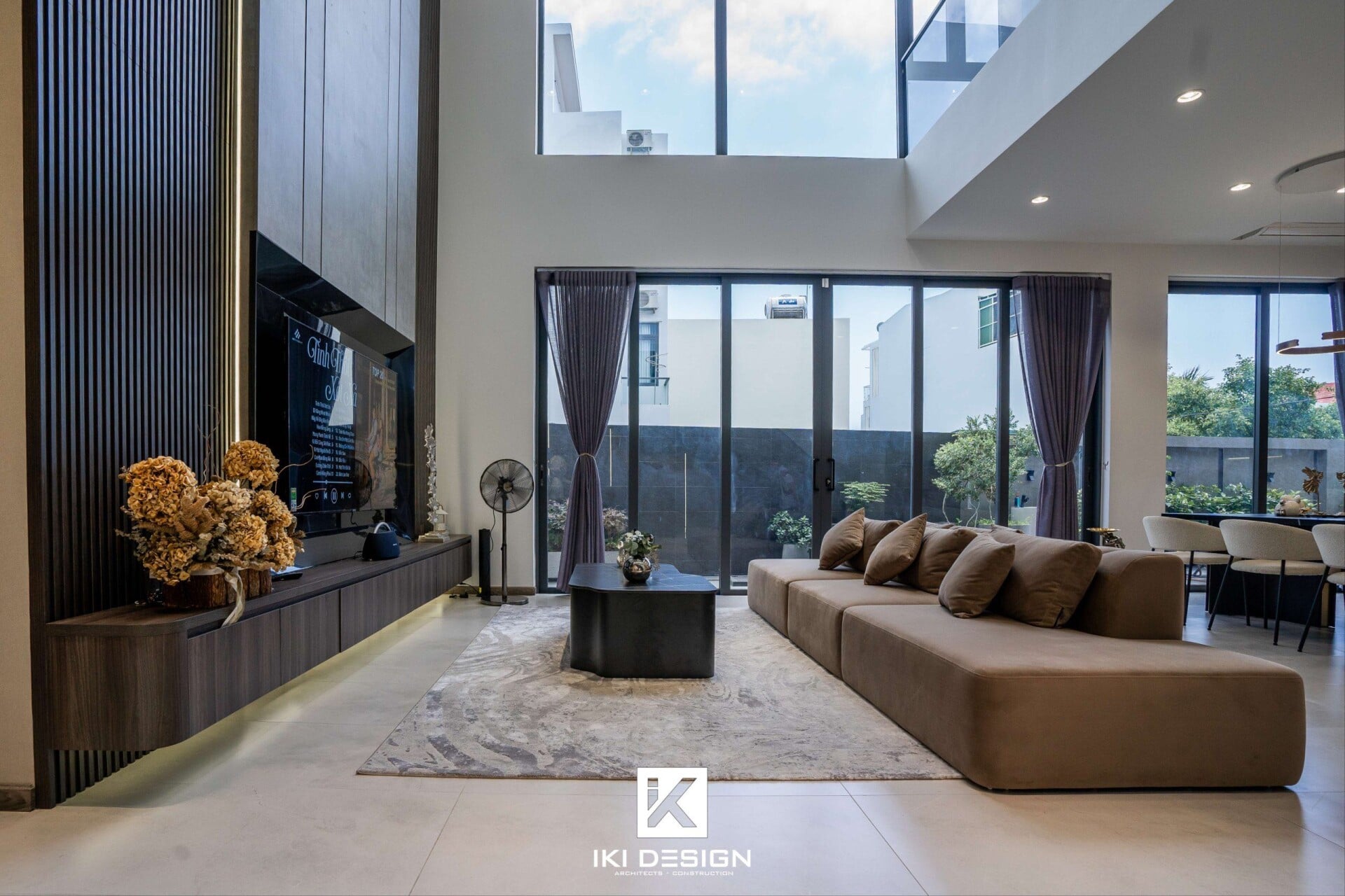 Phòng khách là nơi thể hiện rõ tinh thần “mở – thoáng – kết nối” của Palm Villa. Hệ cửa kính lớn kéo dài hai tầng giúp ánh sáng tự nhiên tràn vào suốt ngày, làm mềm không gian nội thất. Sofa lớn tông nâu ấm, thảm trung tính và mảng tường gỗ dọc cao tạo nên sự sang trọng nhẹ nhàng. Mọi đường nét đều hướng tới sự cân bằng giữa hiện đại và thư giãn.