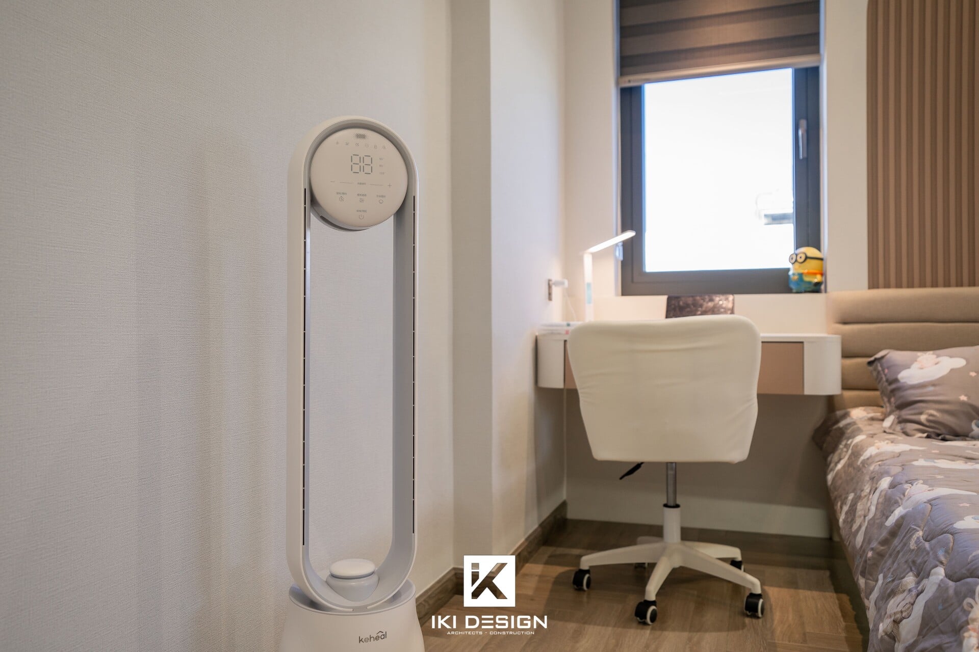 Quạt lọc không khí kiểu dáng hiện đại đặt cạnh bàn học, mang tính ứng dụng và thẩm mỹ cao. Cách bố trí gần cửa sổ giúp lưu thông khí tự nhiên và ánh sáng tốt cho thị giác trẻ.
