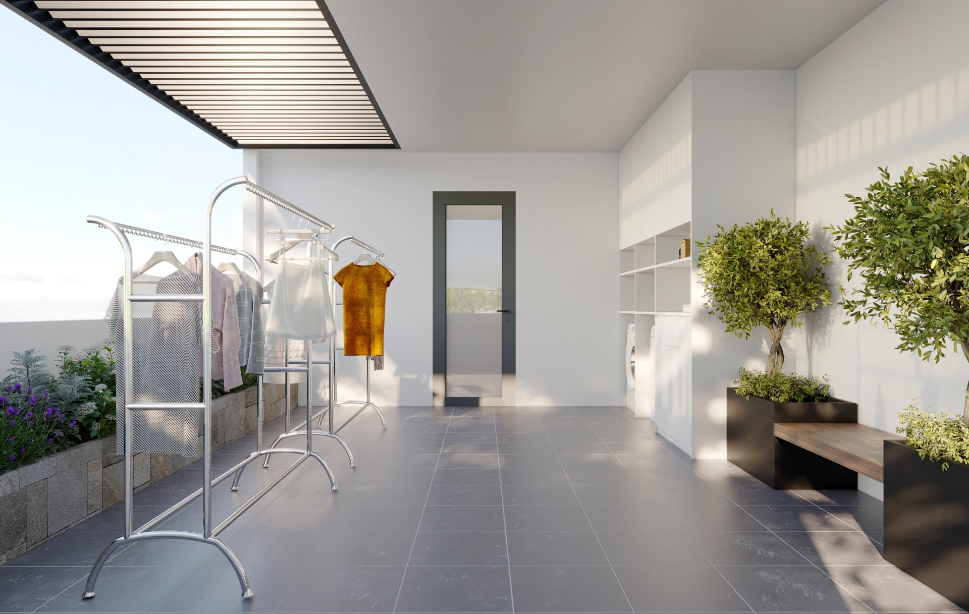 Sân thượng được bố trí như một khu vườn nhỏ trên cao, nơi ánh sáng, thiên nhiên và làn gió hòa vào nhau. Khoảng xanh này là nơi gia chủ có thể đọc sách, trò chuyện hay chỉ đơn giản là tận hưởng một buổi sáng yên bình.