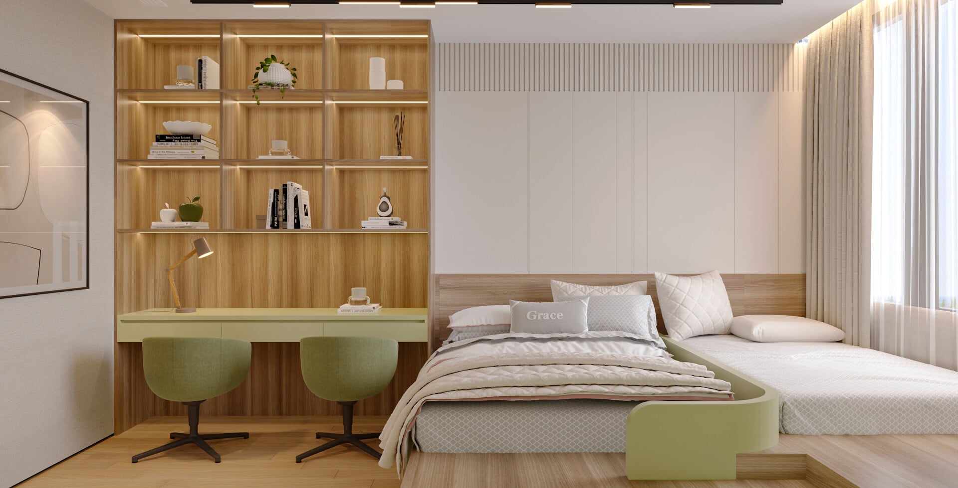 - Khu làm việc trong phòng ngủ được tích hợp tinh gọn, tạo sự riêng tư và tối ưu công năng cho gia chủ bận rộn.