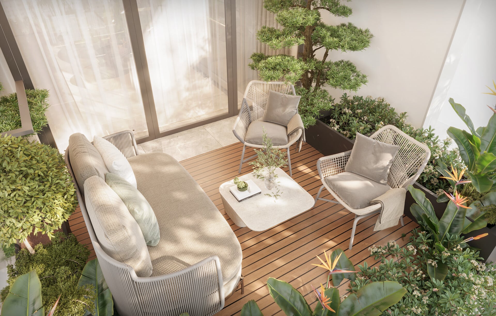 Không gian outdoor ấm áp với sofa ngoài trời, điểm xuyết bởi những cụm cây Tropical - đúng tinh thần Modern Tropical mà 3A Signature theo đuổi.