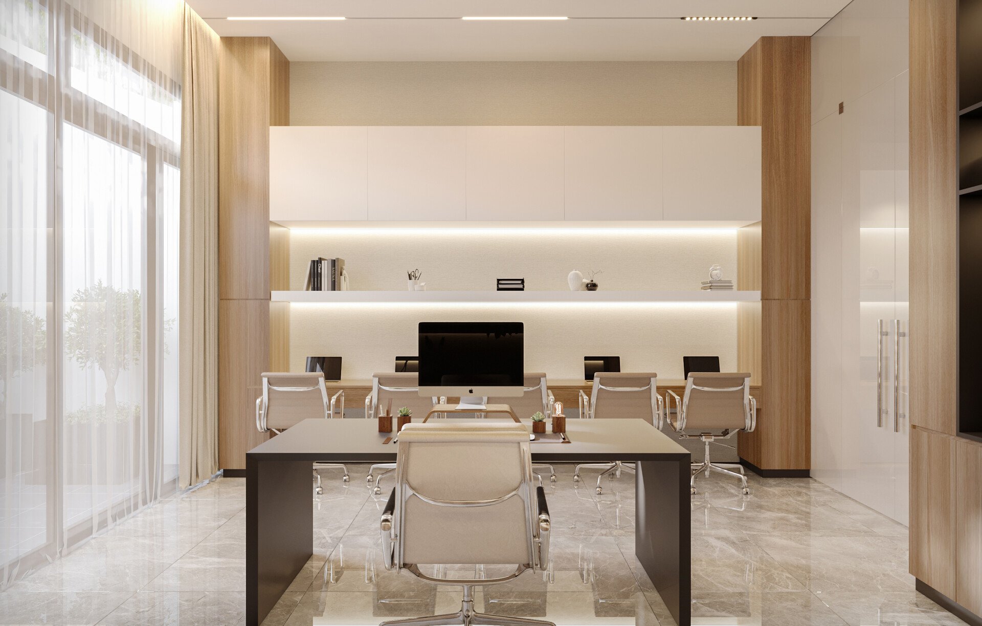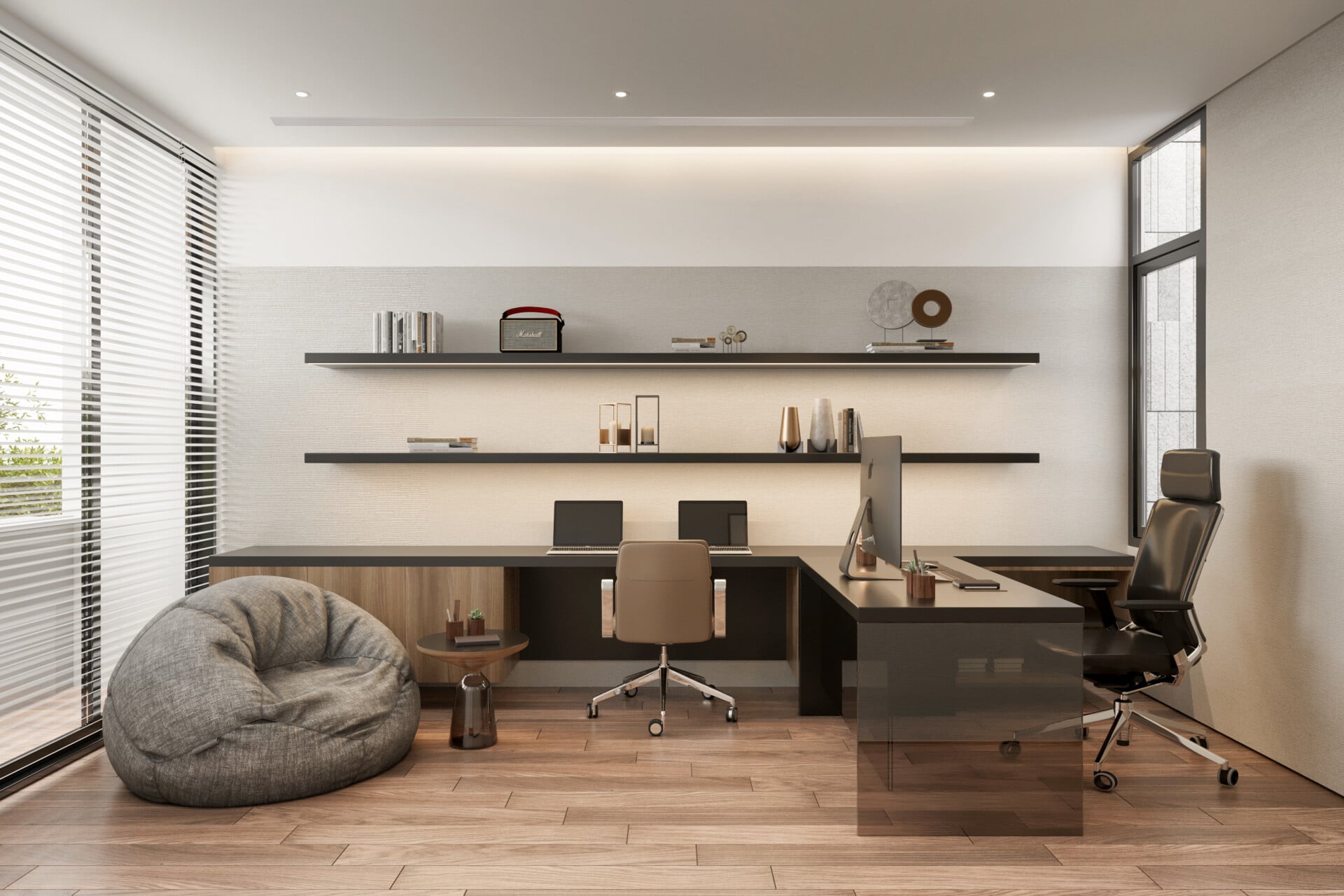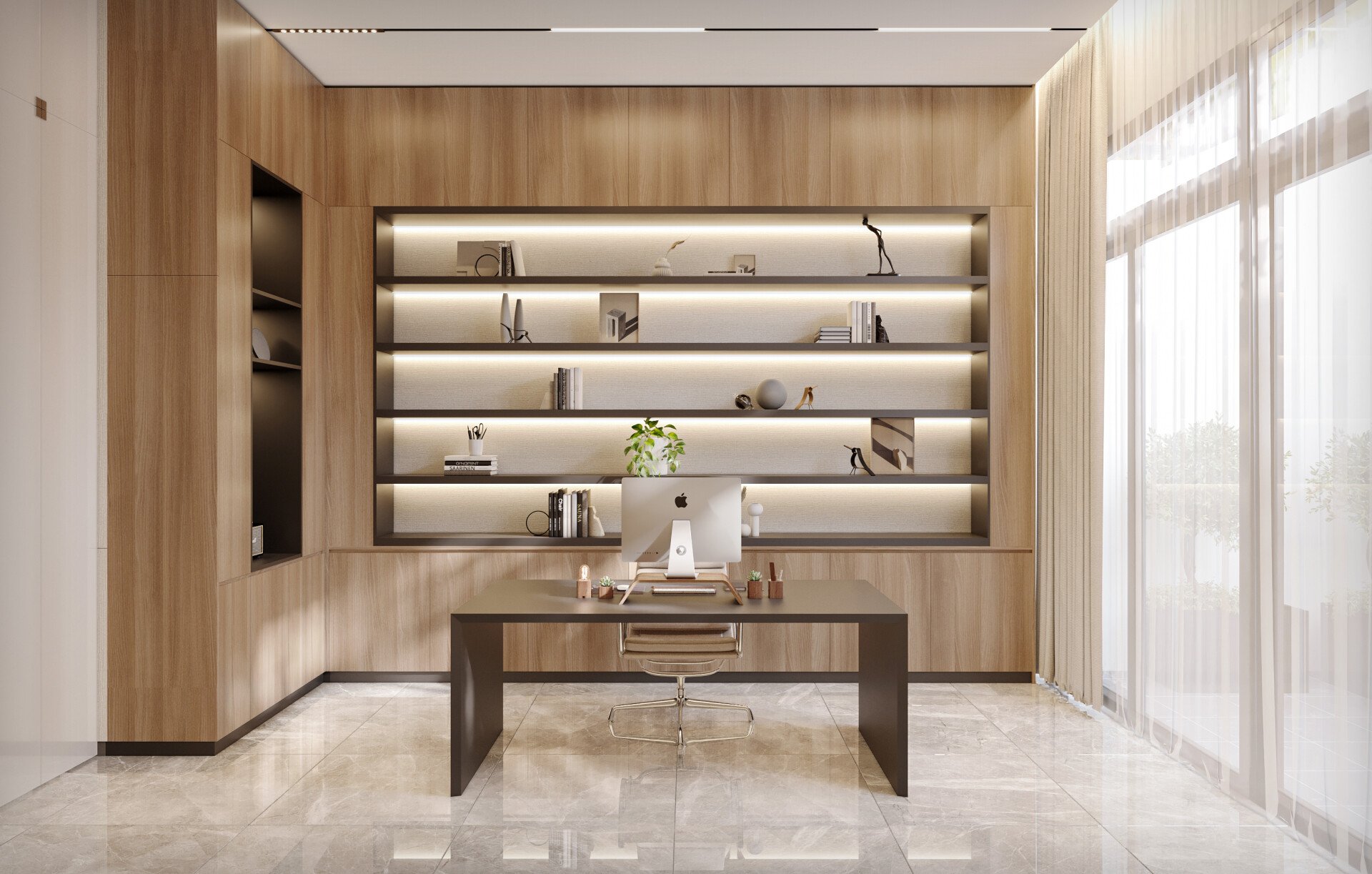 Hệ bàn làm việc chữ L được bố trí khoa học, vừa tạo không gian rộng rãi, vừa tối ưu thao tác cho công việc. Các kệ nổi chạy dài dọc tường vừa tăng diện tích lưu trữ sách - tài liệu, vừa tạo điểm nhấn trang trí hiện đại.