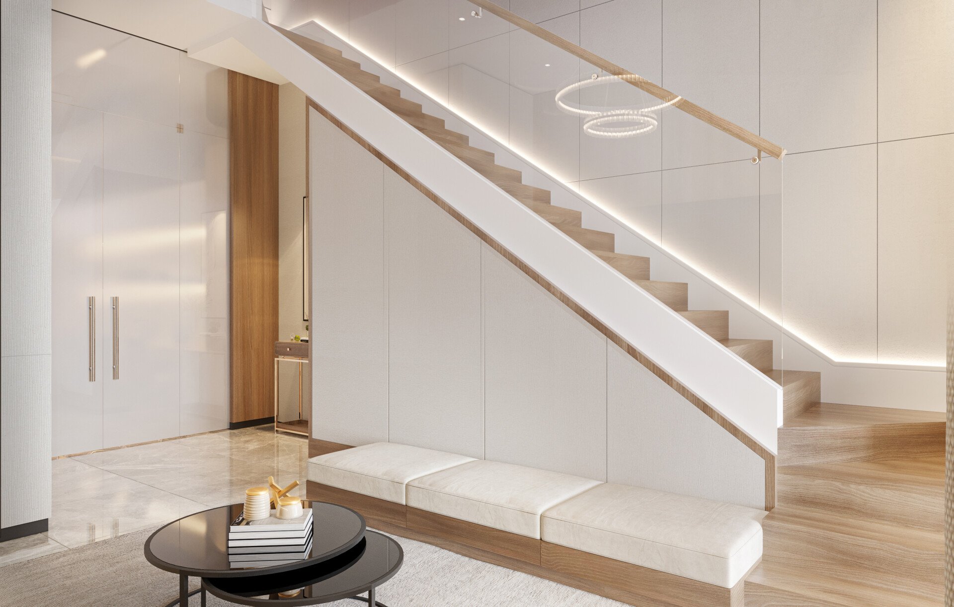 Phòng khách được thiết kế hiện đại với tone màu gỗ chủ đạo, tạo cảm giác ấm áp nhưng vẫn sang trọng. Hệ tủ âm tường và kệ trang trí được tích hợp ánh sáng giúp không gian gọn gàng và có điểm nhấn thẩm mỹ.