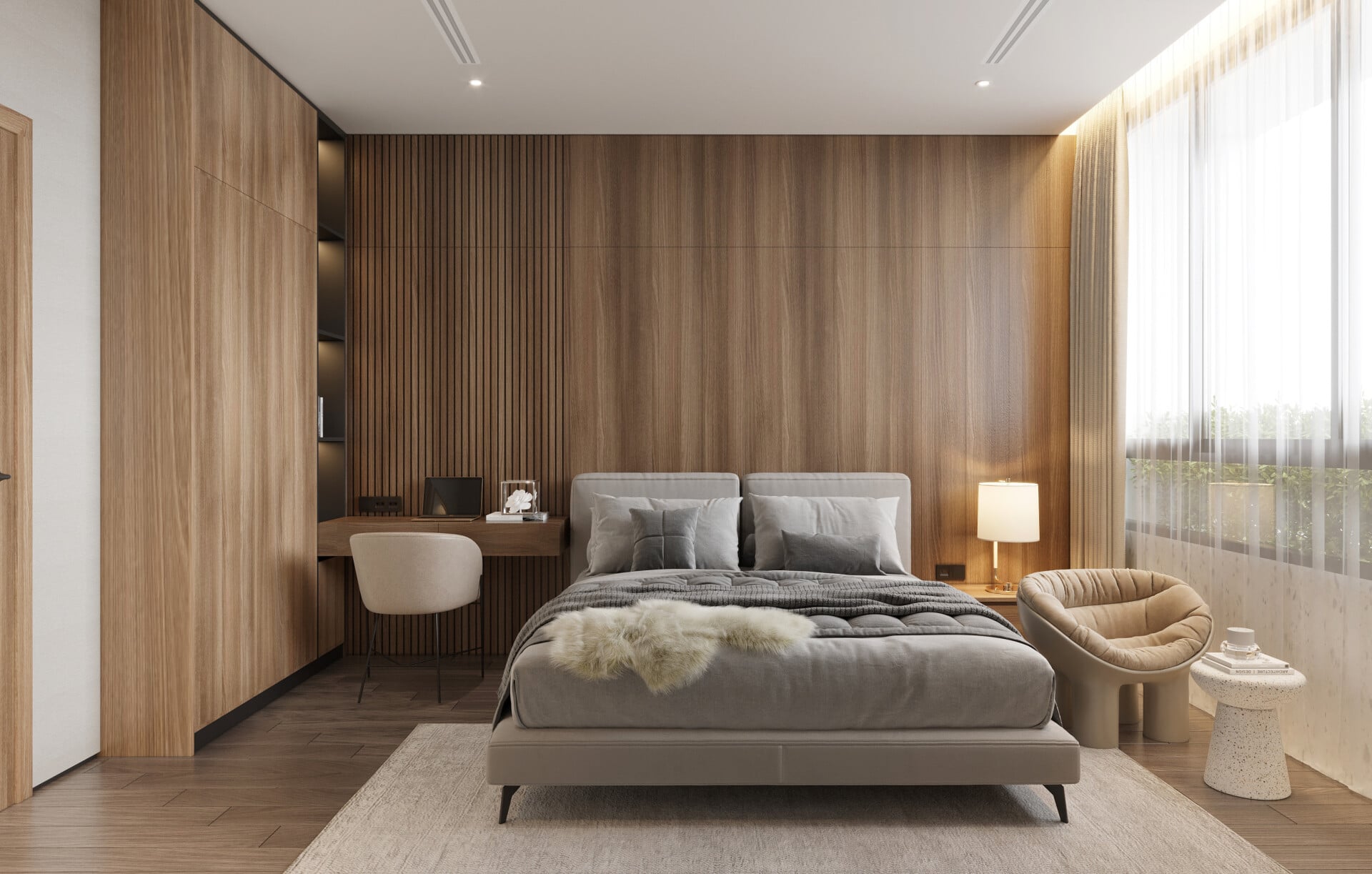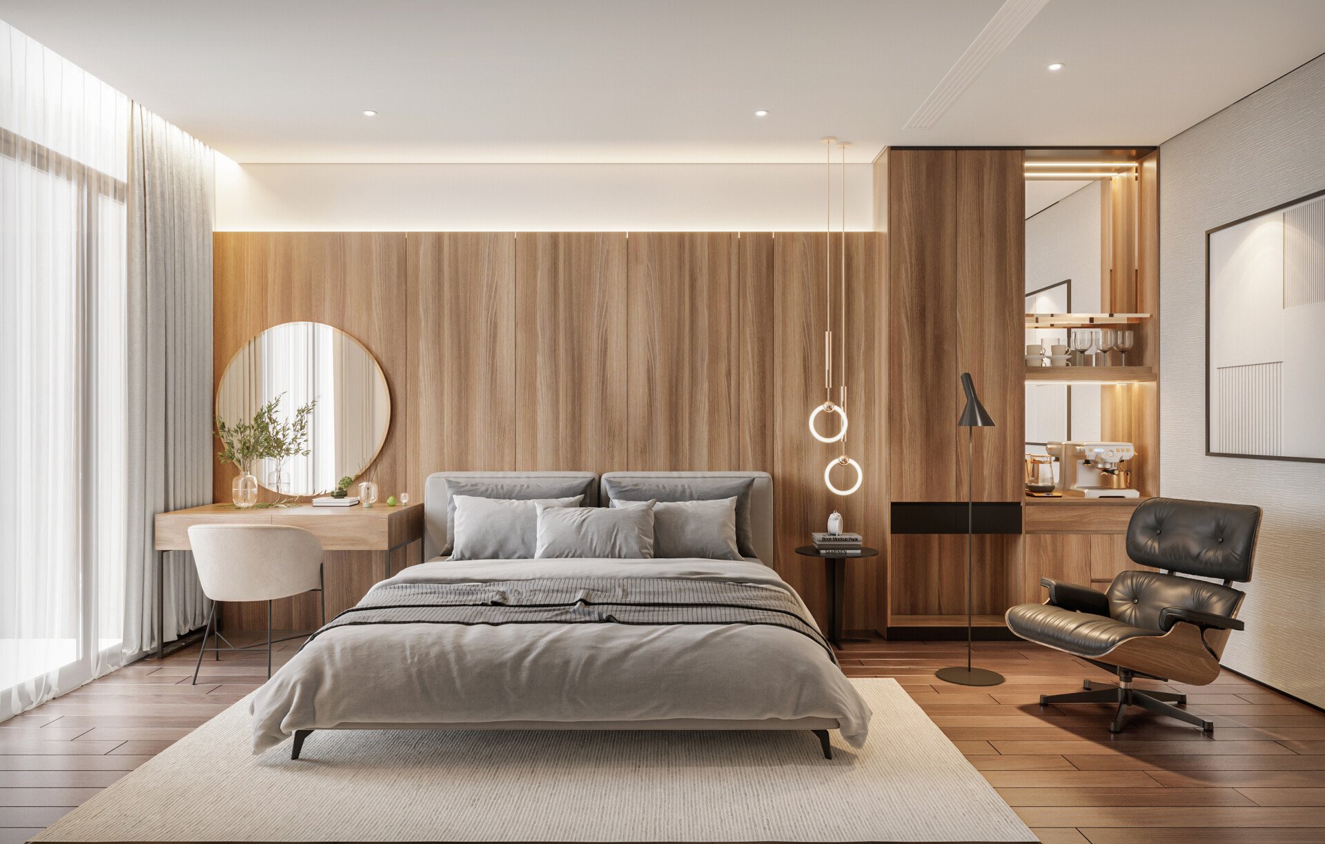 - Phòng ngủ master mang dấu ấn của sự thư thái: gỗ ấm, đường nét tối giản, ánh sáng dịu nhẹ. Các KTS ưu tiên thiết kế khoảng mở lớn đón ánh sáng tự nhiên - giúp căn phòng luôn tràn đầy sinh khí và dễ chịu.