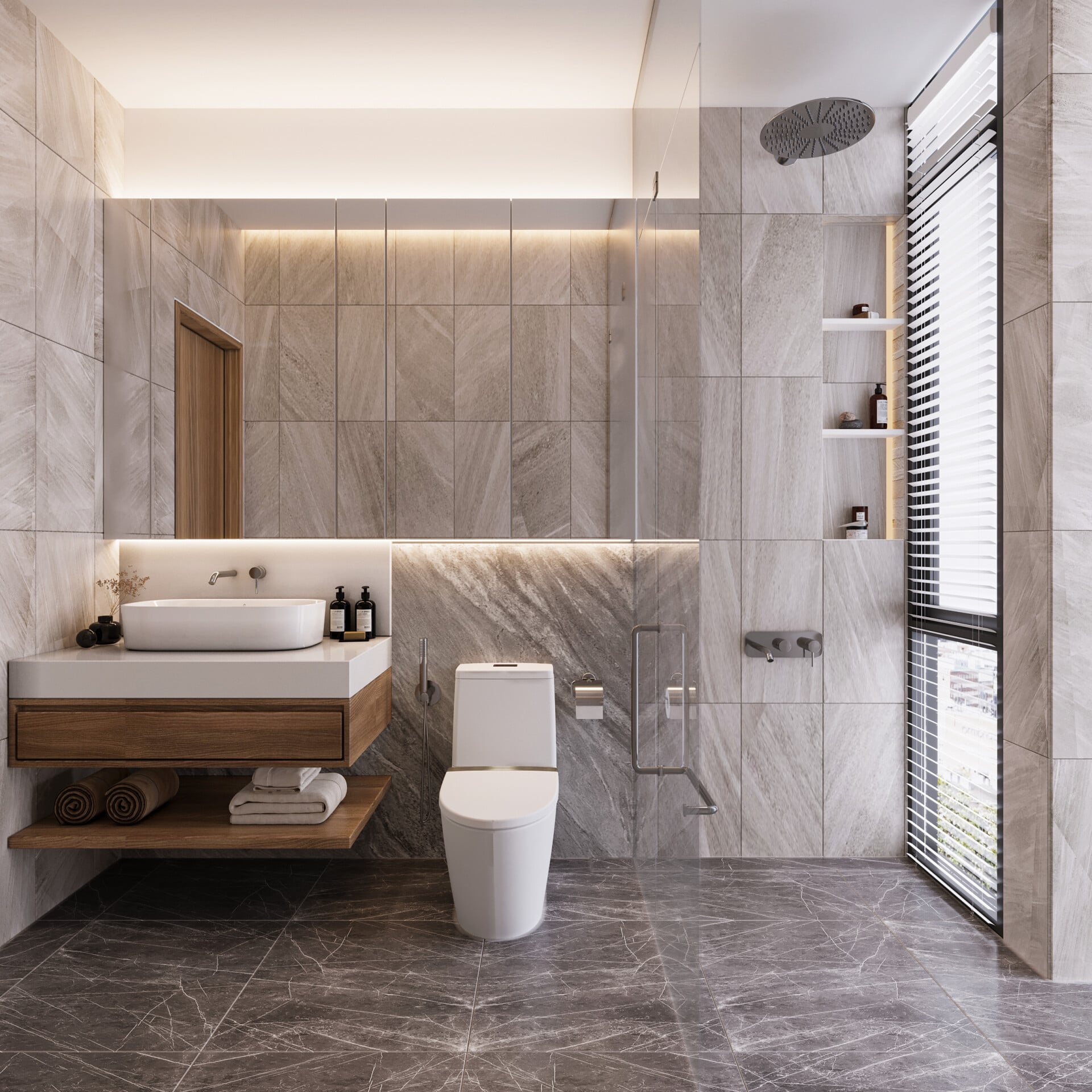 - Phòng tắm master được thiết kế với tone xám - trắng sang trọng. Hệ gạch vân đá, đèn hắt gián tiếp và bố cục tối giản mang lại trải nghiệm thư giãn như spa tại gia. Tủ lavabo treo gọn gàng, vừa thẩm mỹ vừa tiện dụng.