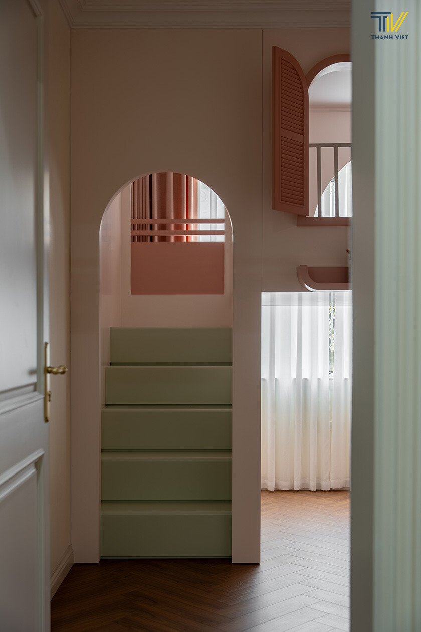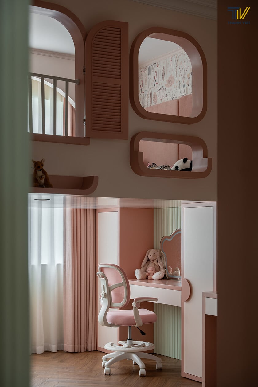 Phòng cho em gái lại ngọt ngào, đáng yêu, nơi sắc hồng nhẹ nhàng phủ lên từng góc nhỏ.  Thiết kế giường tầng tạo nên không gian thú vị. Đây cũng là yêu cầu của chủ nhà để giúp bạn nhỏ yêu thích căn phòng của mình hơn. Từng món đồ, từng sắc màu góp phần nuôi dưỡng trí tưởng tượng và sự tự lập cho bé.