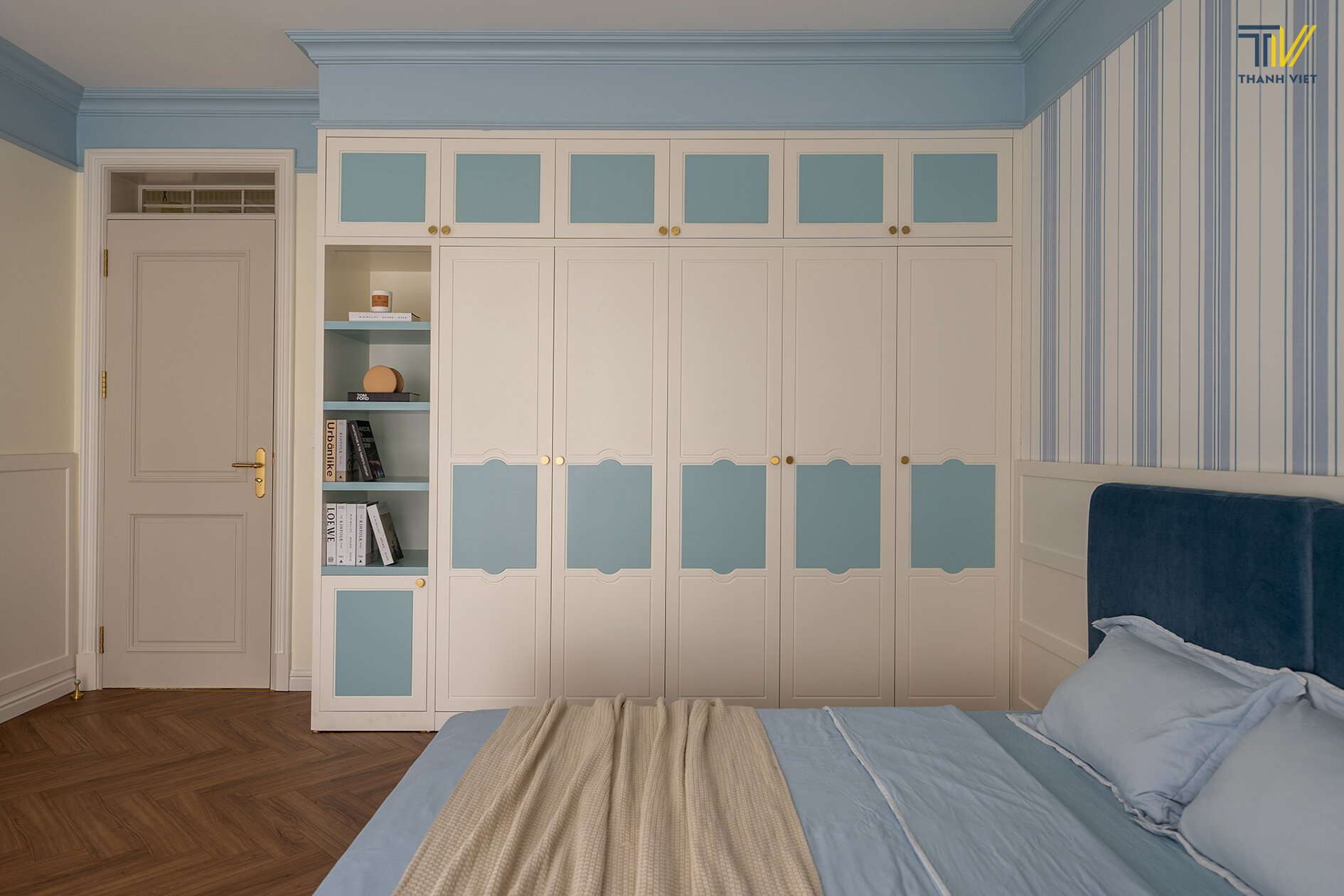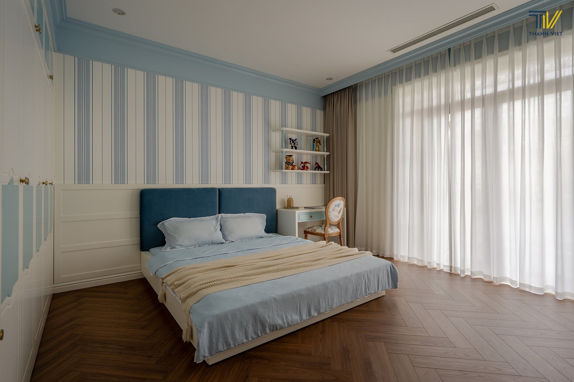 Phòng ngủ bé trai mang đậm tinh thần tự do và phóng khoáng và năng động. Gam màu xanh mát giúp không gian trở nên tươi sáng, kích thích sự sáng tạo và tinh thần khám phá.