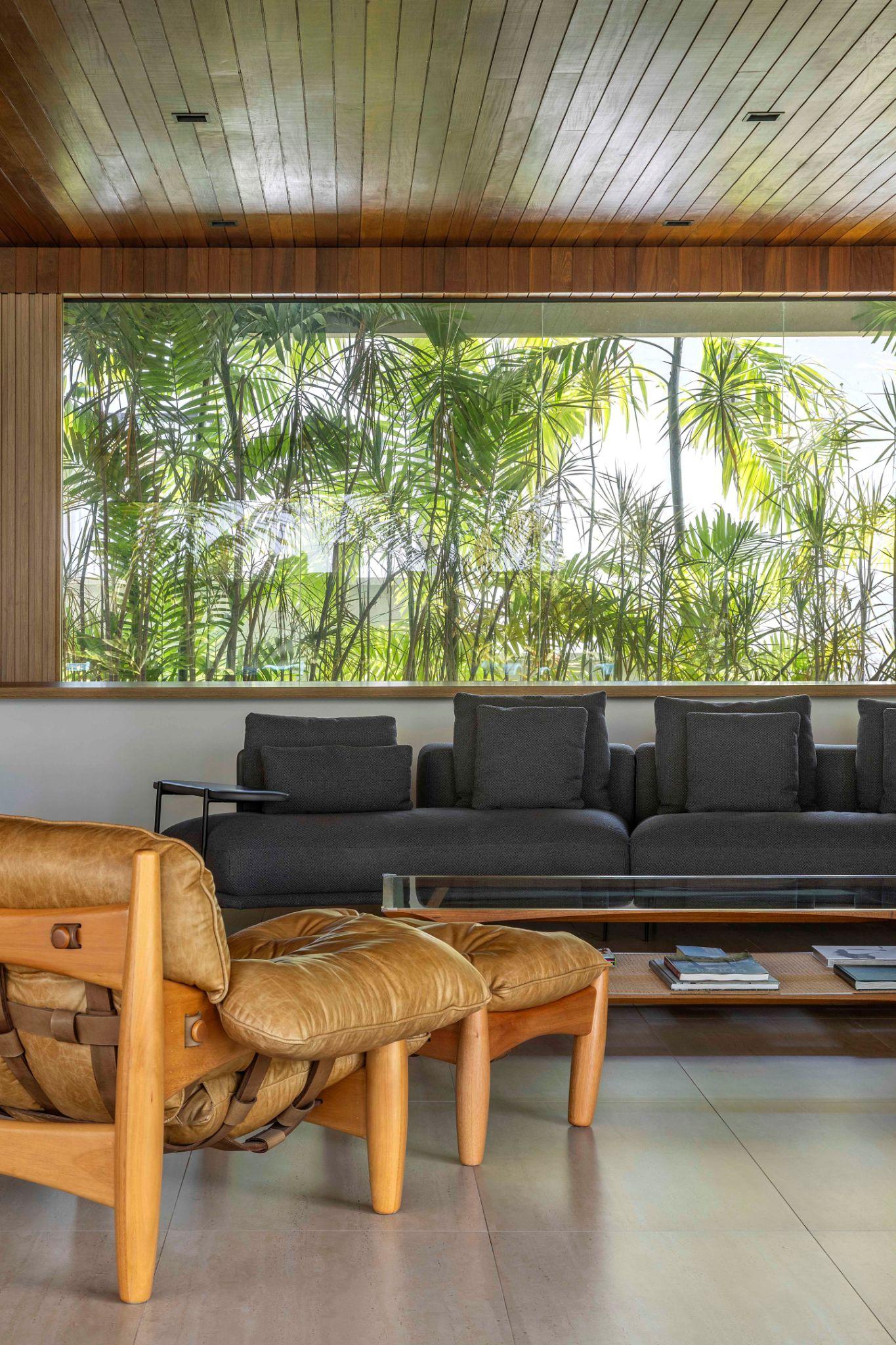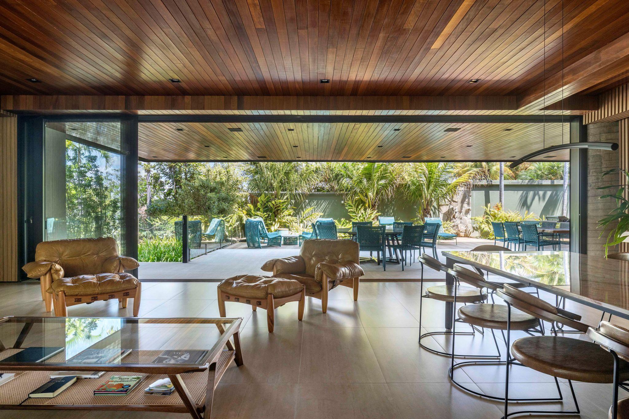 Phòng khách rộng thoáng với trần ốp gỗ và cửa kính lớn mở ra mảng xanh nhiệt đới bên ngoài. Thiết kế mở giúp ánh sáng và gió tự nhiên lan tỏa khắp không gian sinh hoạt trung tâm