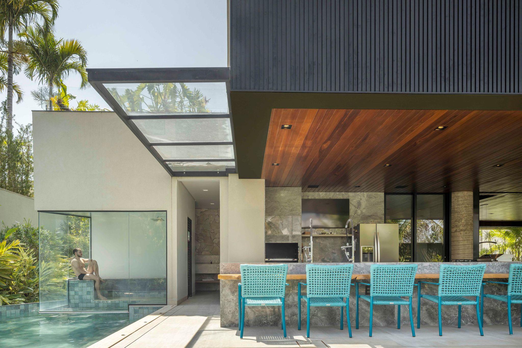 Khu bếp và quầy bar ngoài trời liền kề hồ bơi, với mái kính và trần gỗ kéo dài. Giải pháp liên thông chức năng tạo nên trải nghiệm giải trí mạch lạc và tiện lợi cho gia chủ