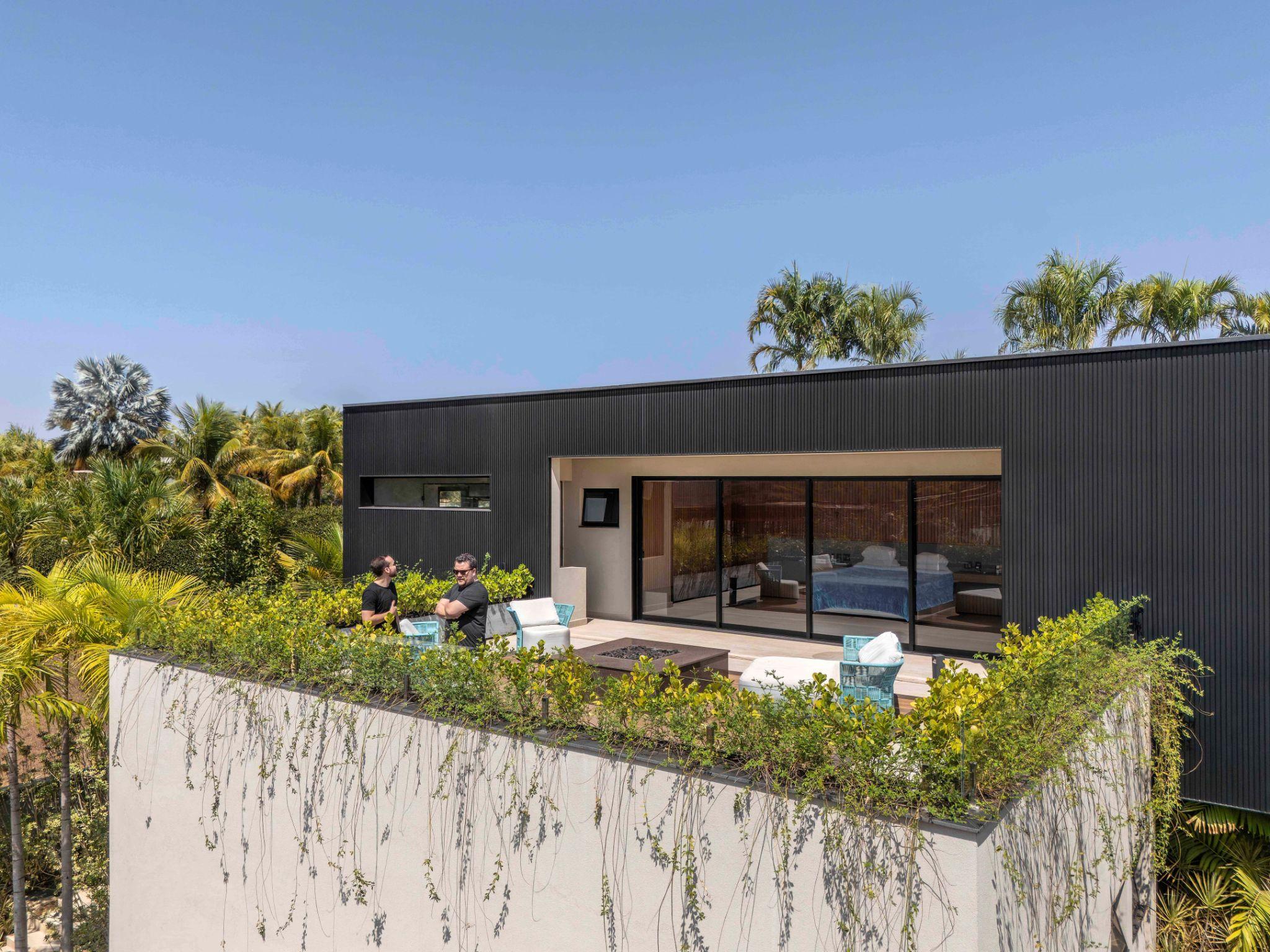 Khối sân thượng được bao phủ bởi dây leo và cây bụi, ngay bên dưới là hồ bơi, tạo lớp xanh mềm mại ôm lấy công trình. Việc phủ xanh ban công giúp giảm nhiệt và tăng sự riêng tư cho khu nghỉ ngoài trời