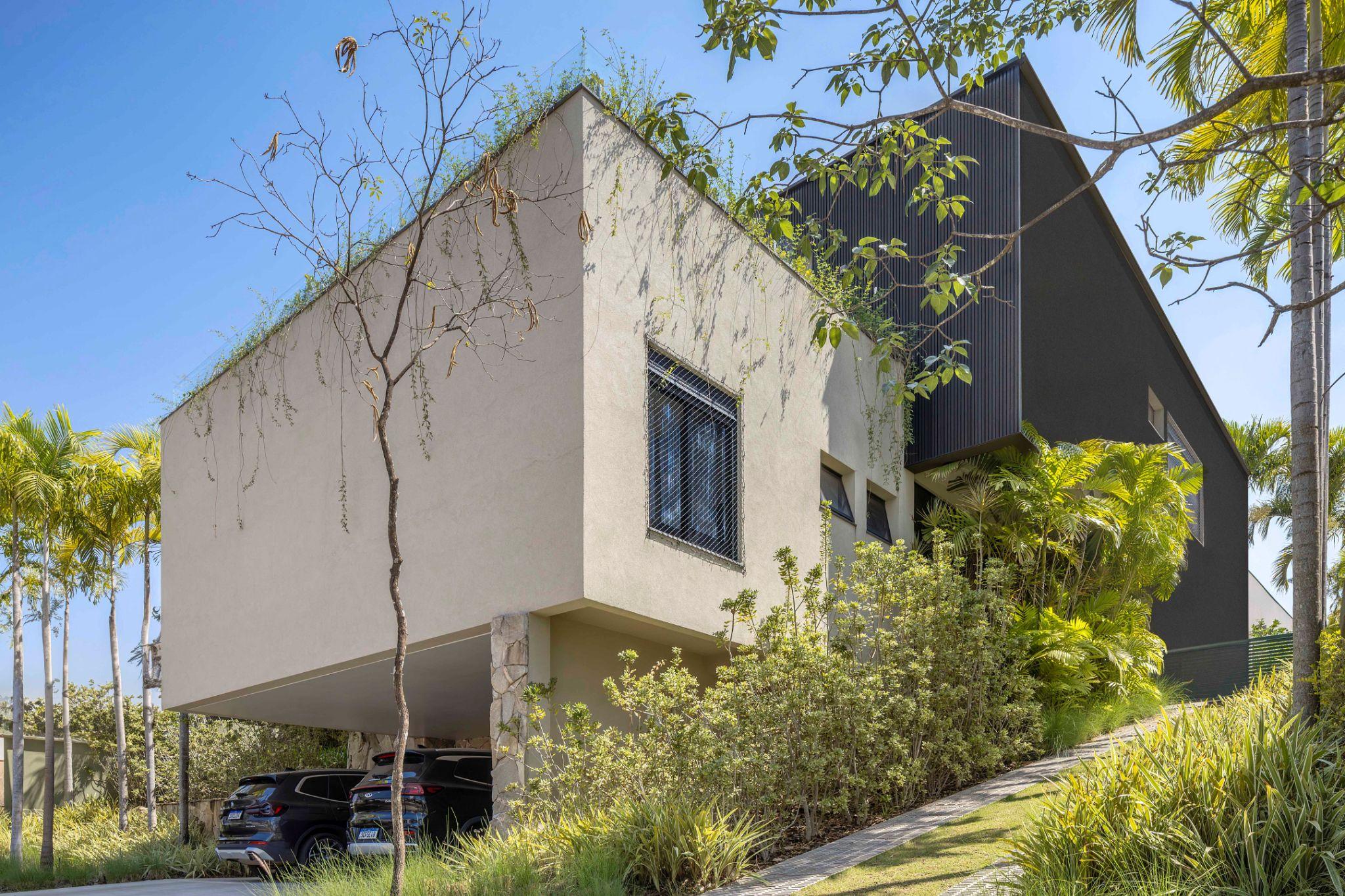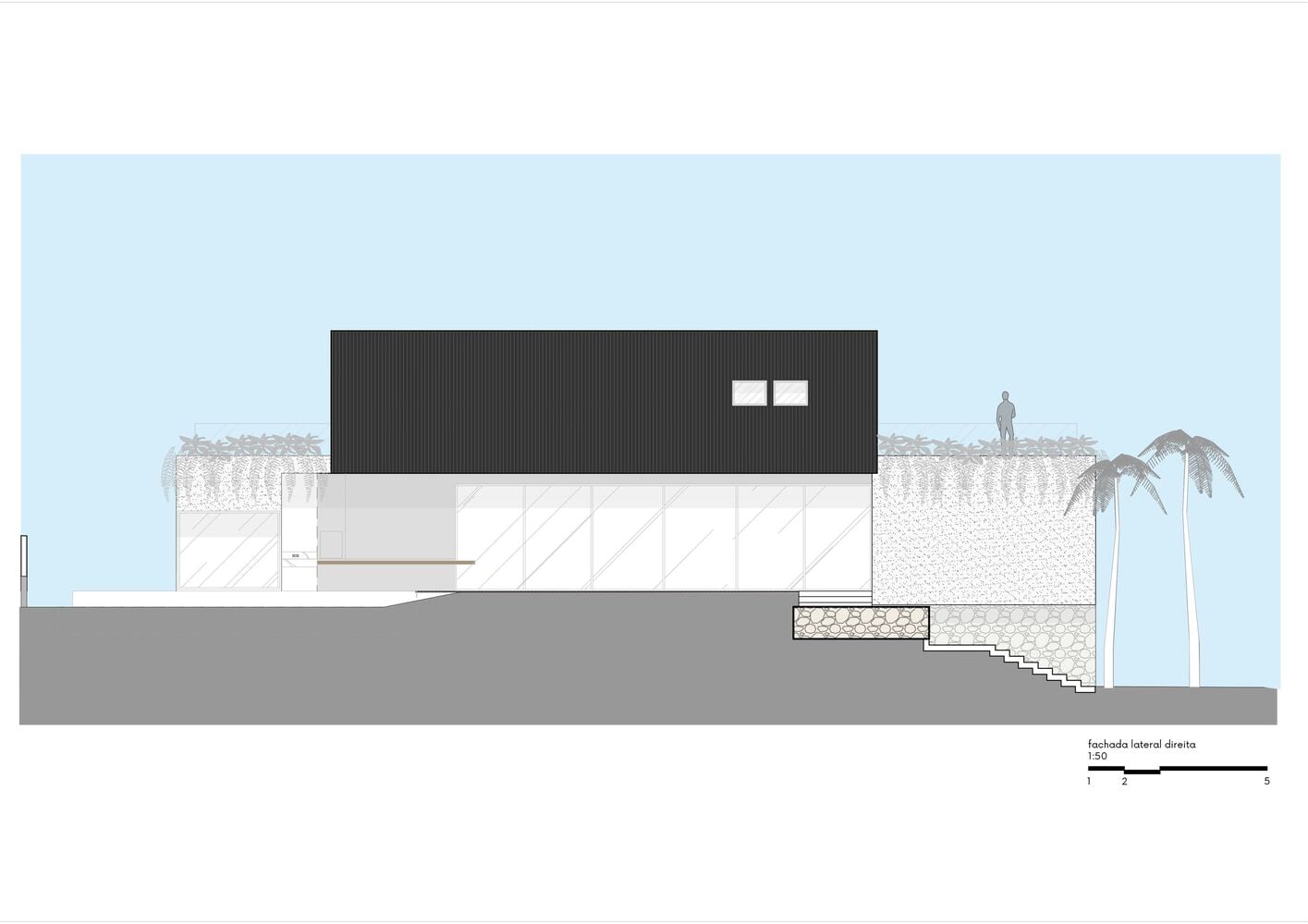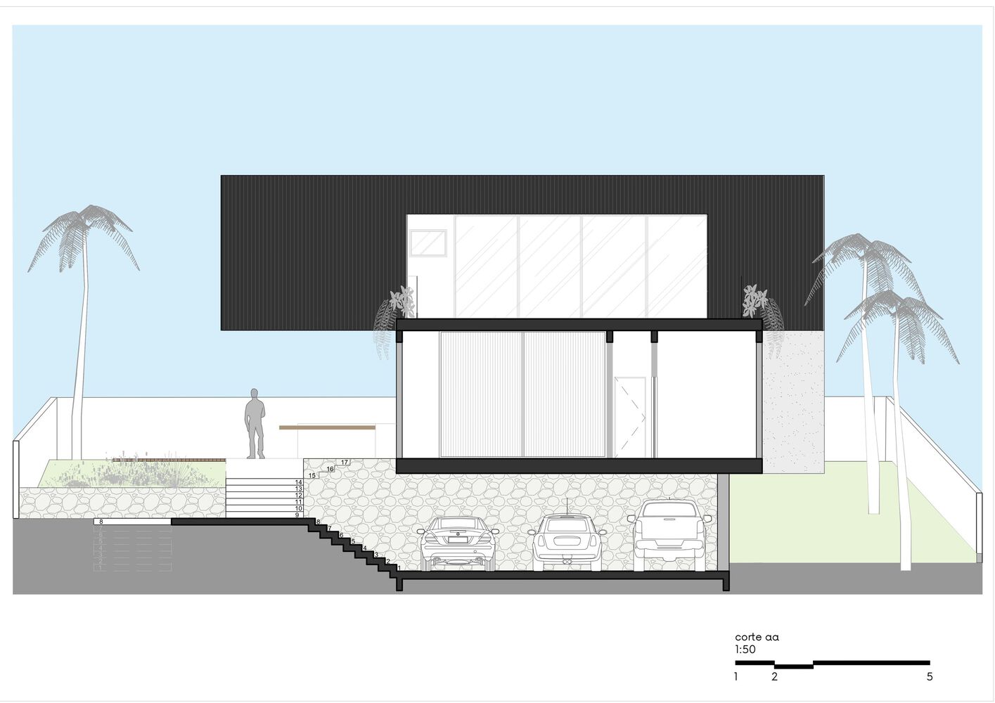 Khối thấp nhất, bám vào cao độ đường, được dành cho gara và lối tiếp cận đầu tiên. Khối giữa là trái tim của ngôi nhà – nơi diễn ra sinh hoạt chính của gia đình. Trên cùng là khối phòng ngủ, được nâng lên để nhìn ra hồ và thảm thực vật cerrado đặc trưng của miền Trung Brazil.