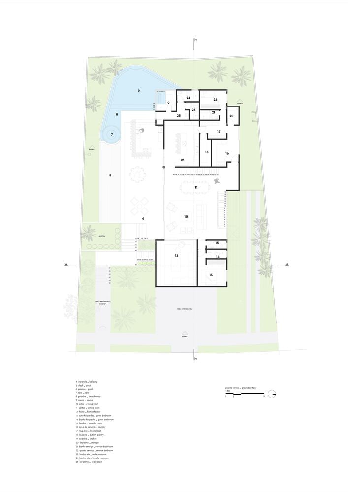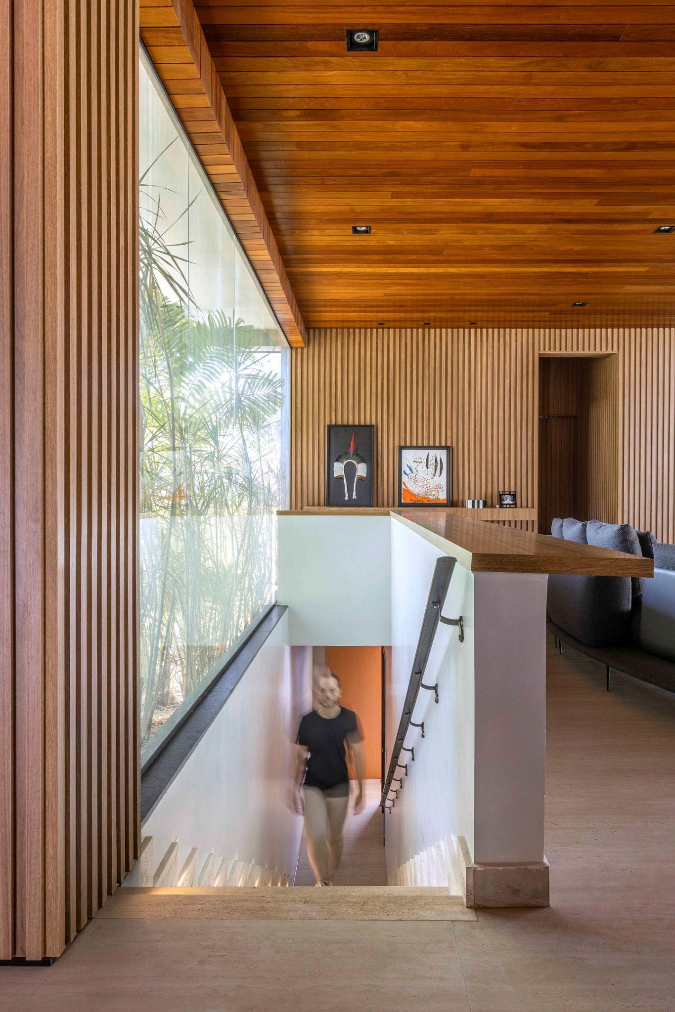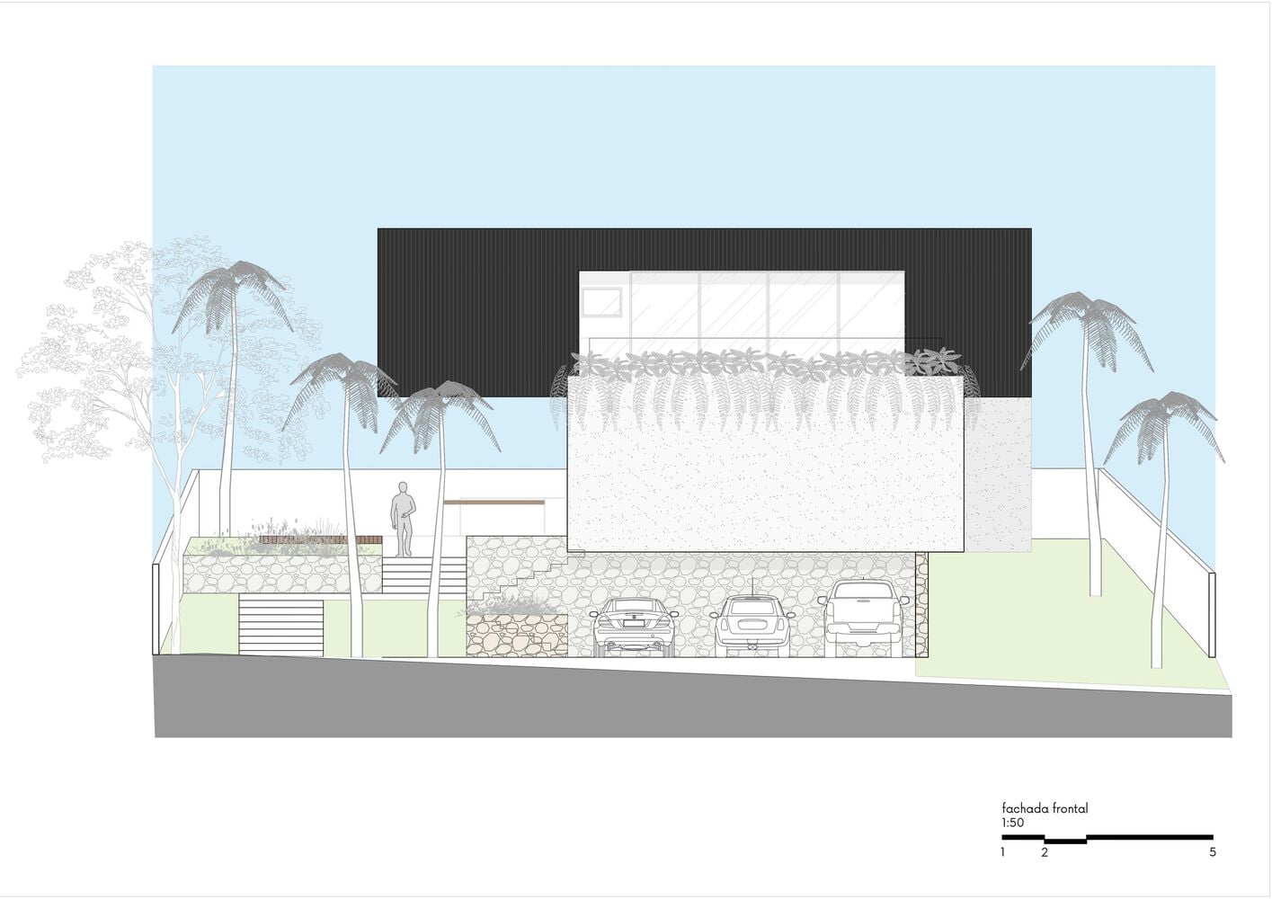 Khối thấp nhất, bám vào cao độ đường, được dành cho gara và lối tiếp cận đầu tiên. Khối giữa là trái tim của ngôi nhà – nơi diễn ra sinh hoạt chính của gia đình. Trên cùng là khối phòng ngủ, được nâng lên để nhìn ra hồ và thảm thực vật cerrado đặc trưng của miền Trung Brazil.