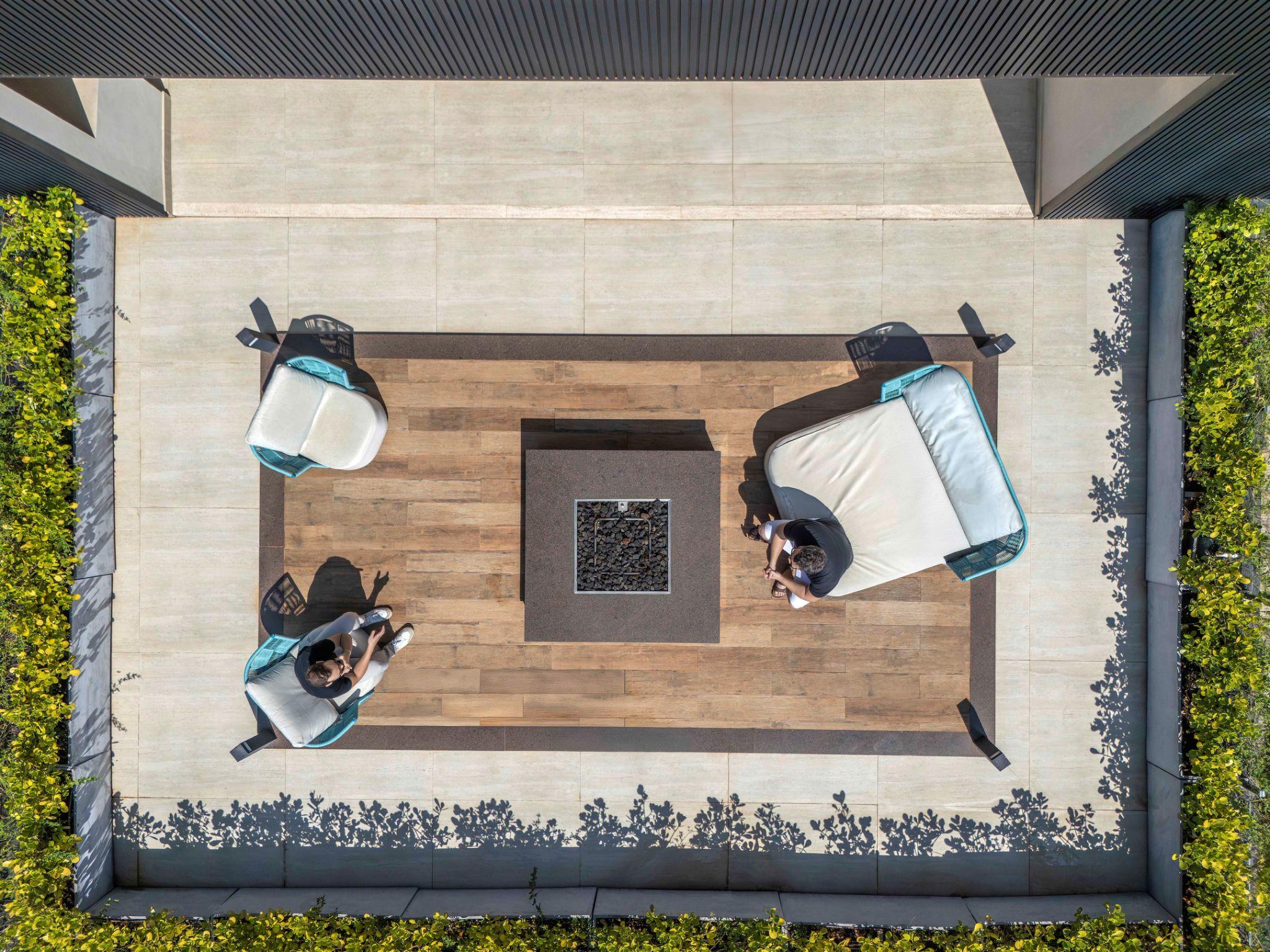 Sân thượng nhìn từ trên xuống cho thấy bố cục ghế – bàn được đặt trên nền gỗ trung tâm, viền quanh là mảng cây xanh. Thiết kế đối xứng tạo không gian tĩnh lặng để nghỉ ngơi và ngắm cảnh