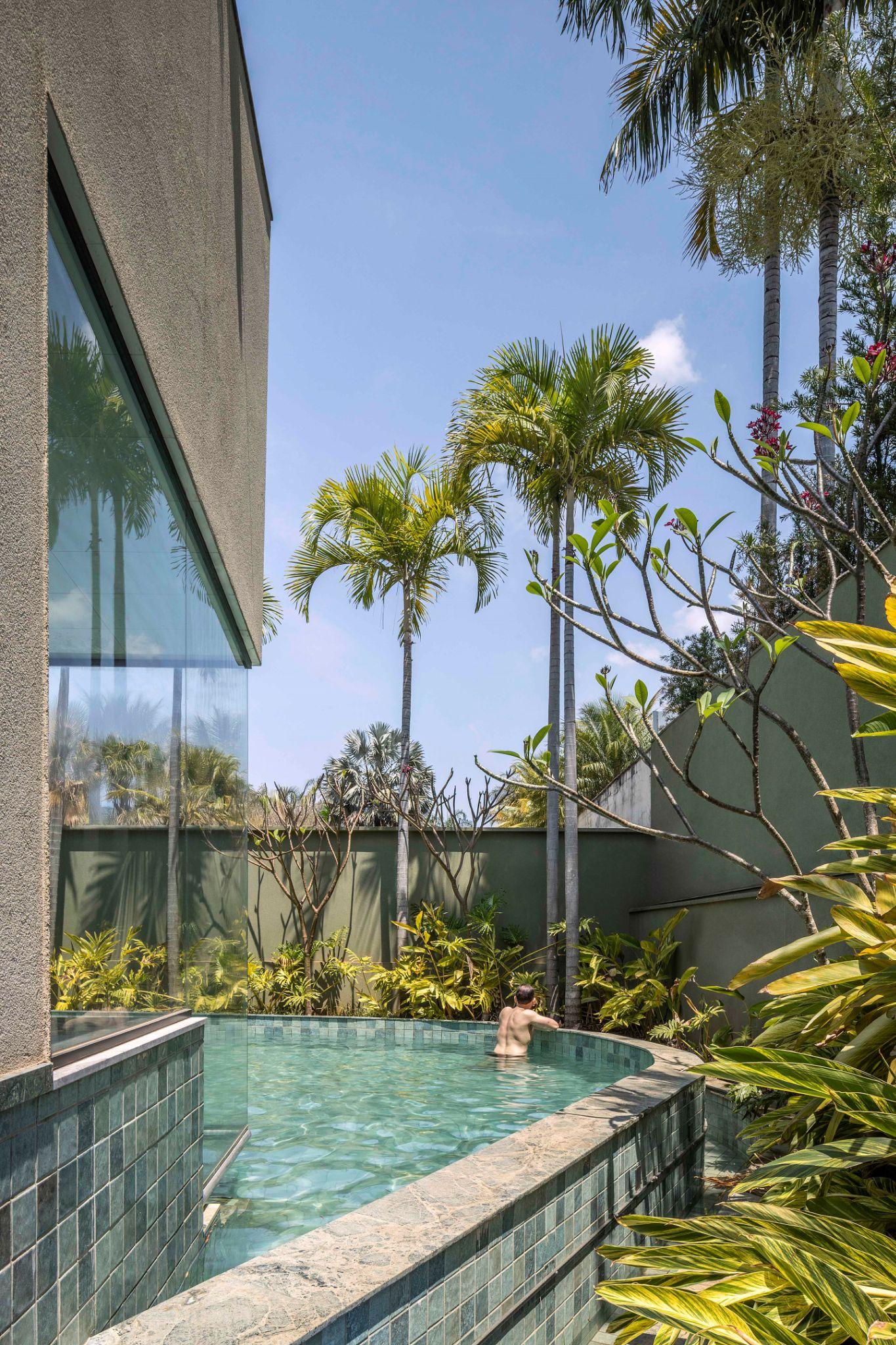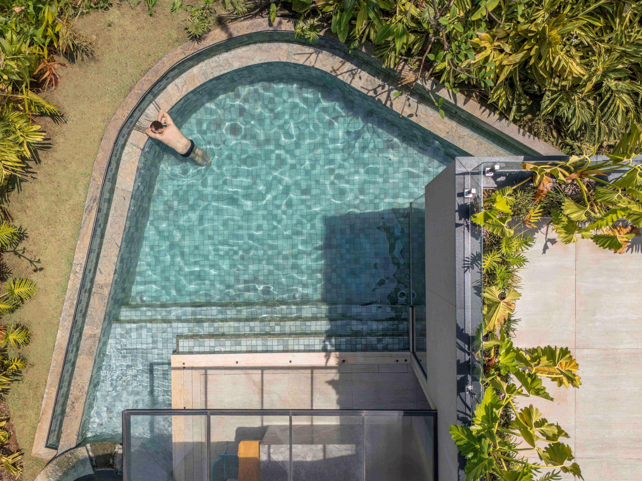 Hồ bơi ôm theo đường viền của khối nhà, tạo trải nghiệm tắm giữa khoảng xanh nhiệt đới. Thành hồ ốp gạch xanh giúp phản chiếu ánh sáng tự nhiên, mang lại cảm giác mát dịu suốt ngày