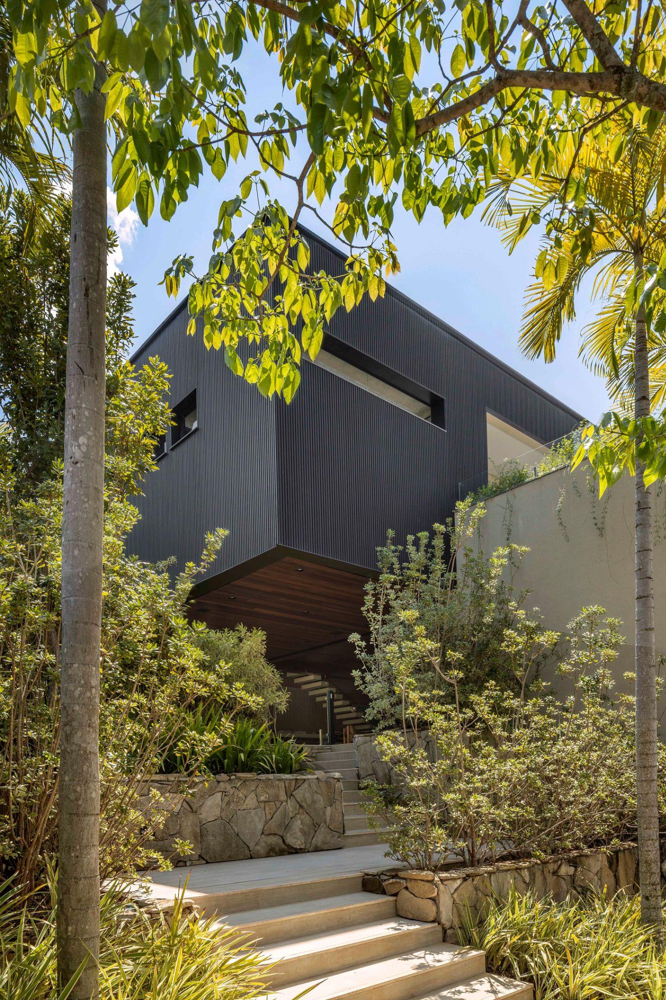 Lối lên nhà được bao quanh bởi cây xanh và khối công trình đen nổi bật phía trên. Hình khối lệch tầng theo địa hình tạo nên dáng vẻ nhẹ và thon gọn cho toàn bộ công trình