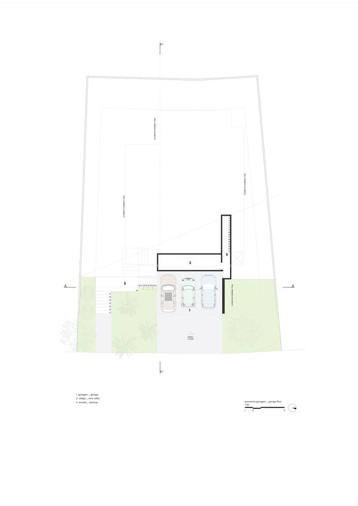 Bản vẽ mặt bằng tầng hầm của Acapu House cho thấy khu vực gara ba chỗ rộng rãi kết hợp lối thang dẫn lên tầng chính. Không gian được bố trí gọn về một phía để tối ưu phần đất dốc tự nhiên của khuôn viên