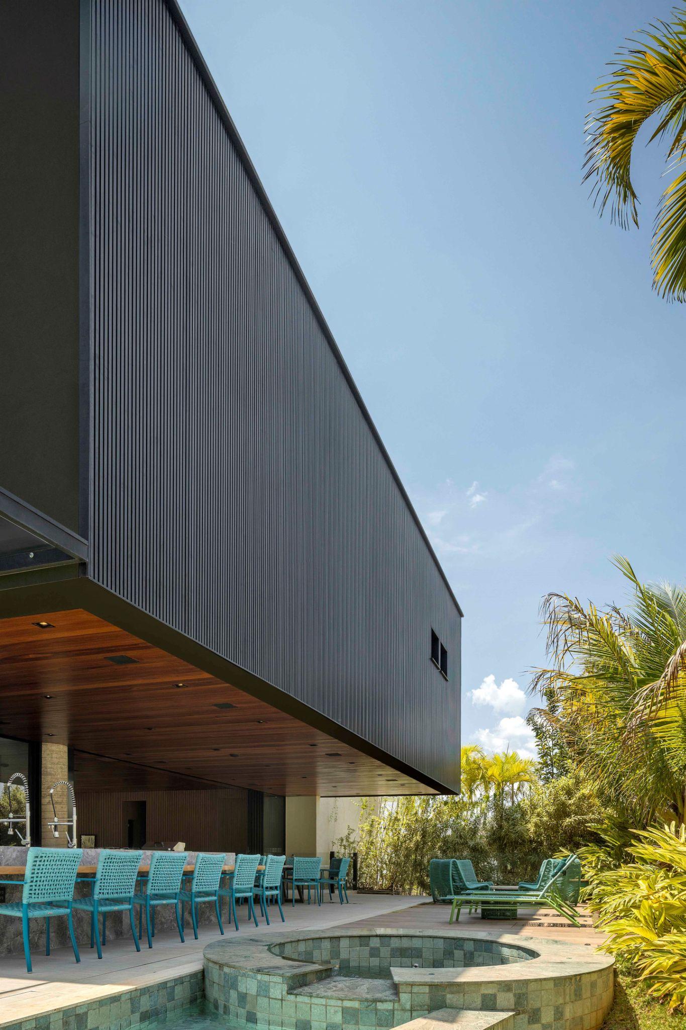 Khối phòng ngủ trên cao phủ lớp lam dọc màu tối, tạo hình khối mạnh mẽ khi nhìn từ sân hồ bơi. Việc nâng khối trên giúp nhà thoáng hơn và che nắng một phần cho sân bên dưới