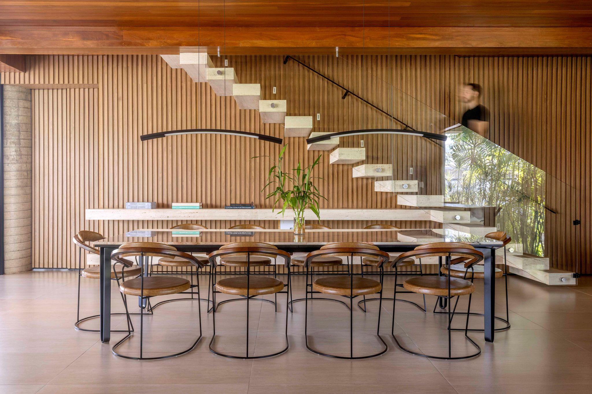 Bàn ăn dài đặt dưới trần gỗ ấm, phía sau là cầu thang đá nổi chạy dọc tường lam gỗ. Cầu thang kết hợp lan can kính tạo cảm giác nhẹ, giữ tầm nhìn thông suốt giữa các khu vực