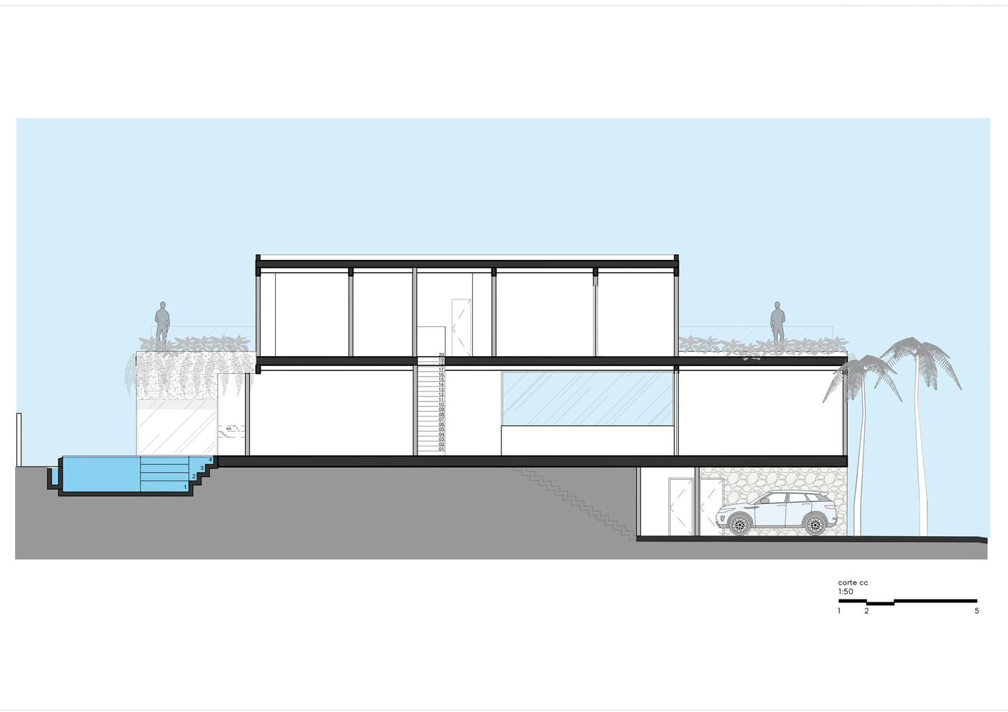 Mặt cắt dọc thể hiện hai tầng chính của ngôi nhà với mảng kính lớn hướng ra hồ bơi và vườn. Khối trên có mái xanh và sân thượng, tạo lớp đệm sinh thái đồng thời che nắng cho tầng dưới