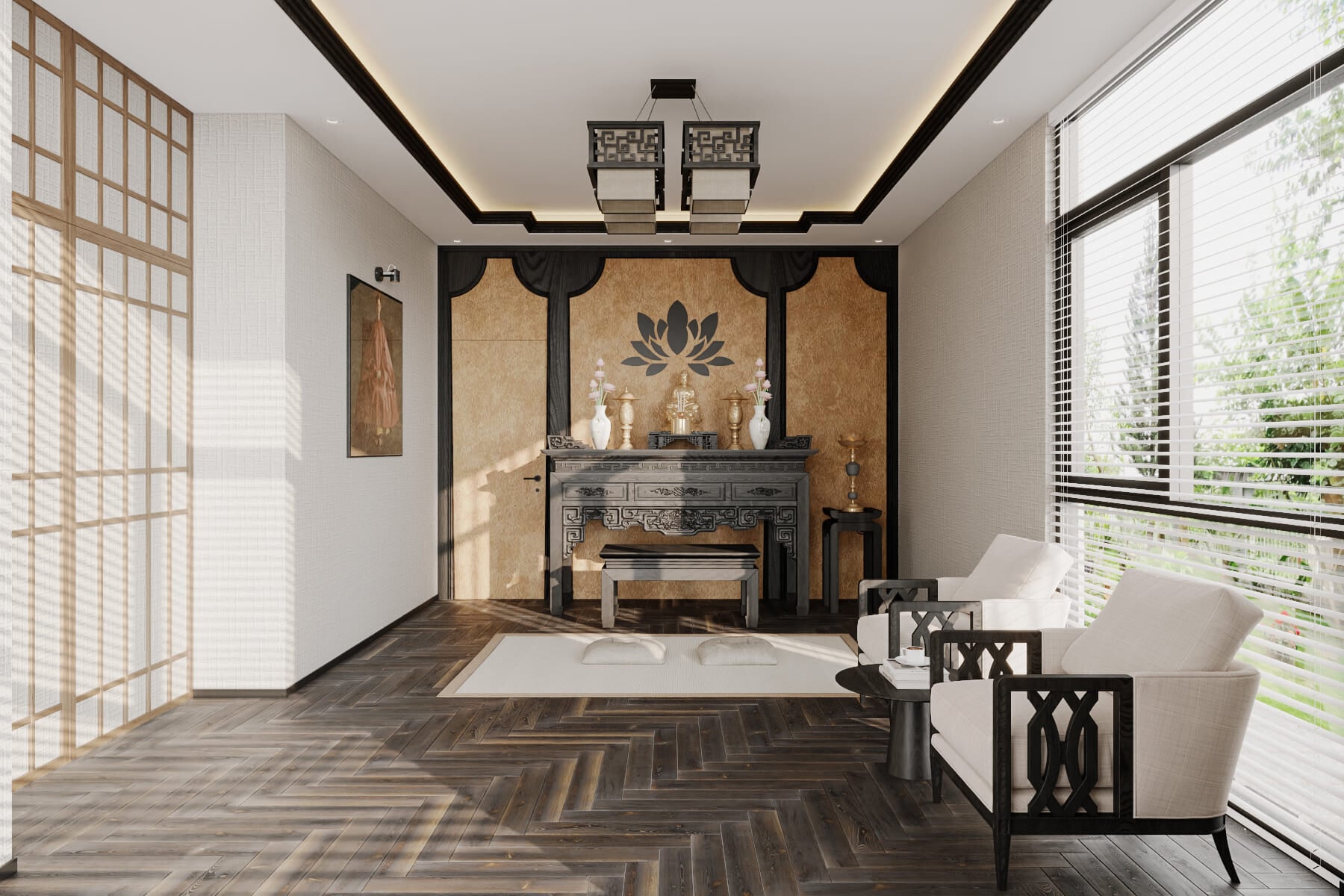 Phong cách nội thất phòng thờ nên tinh giản, ấm cúng và sử dụng ánh sáng nhẹ.