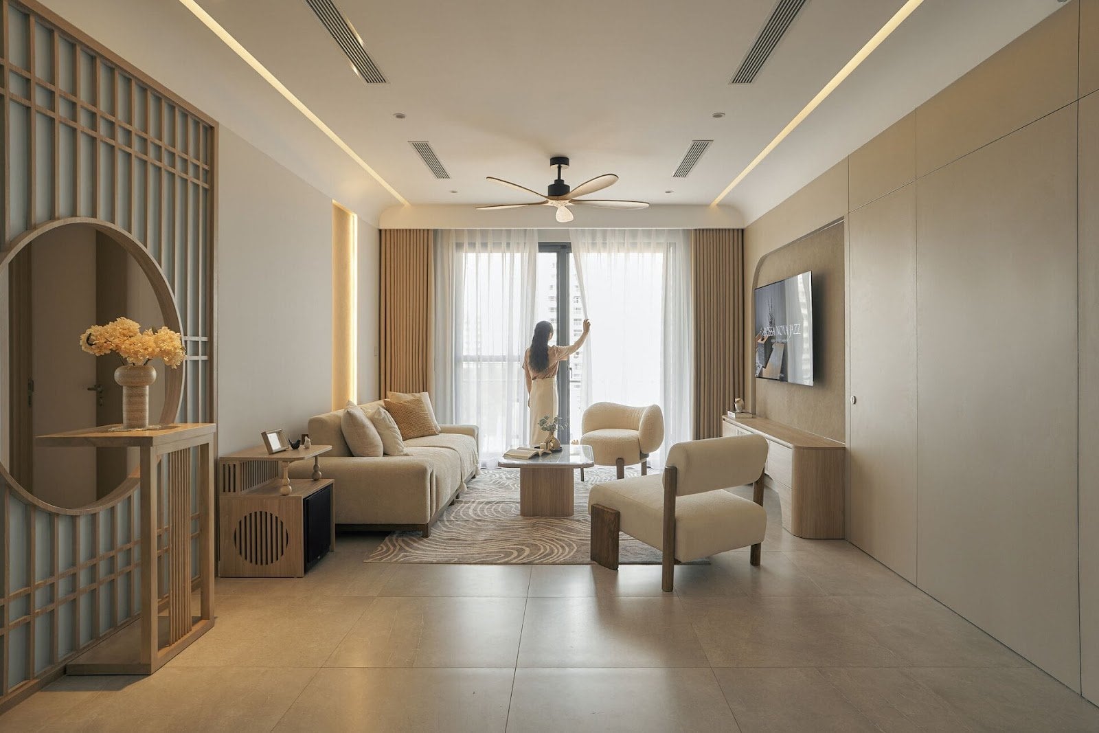 • Rèm cửa và thảm sàn: Giúp không gian ấm cúng, hài hòa.