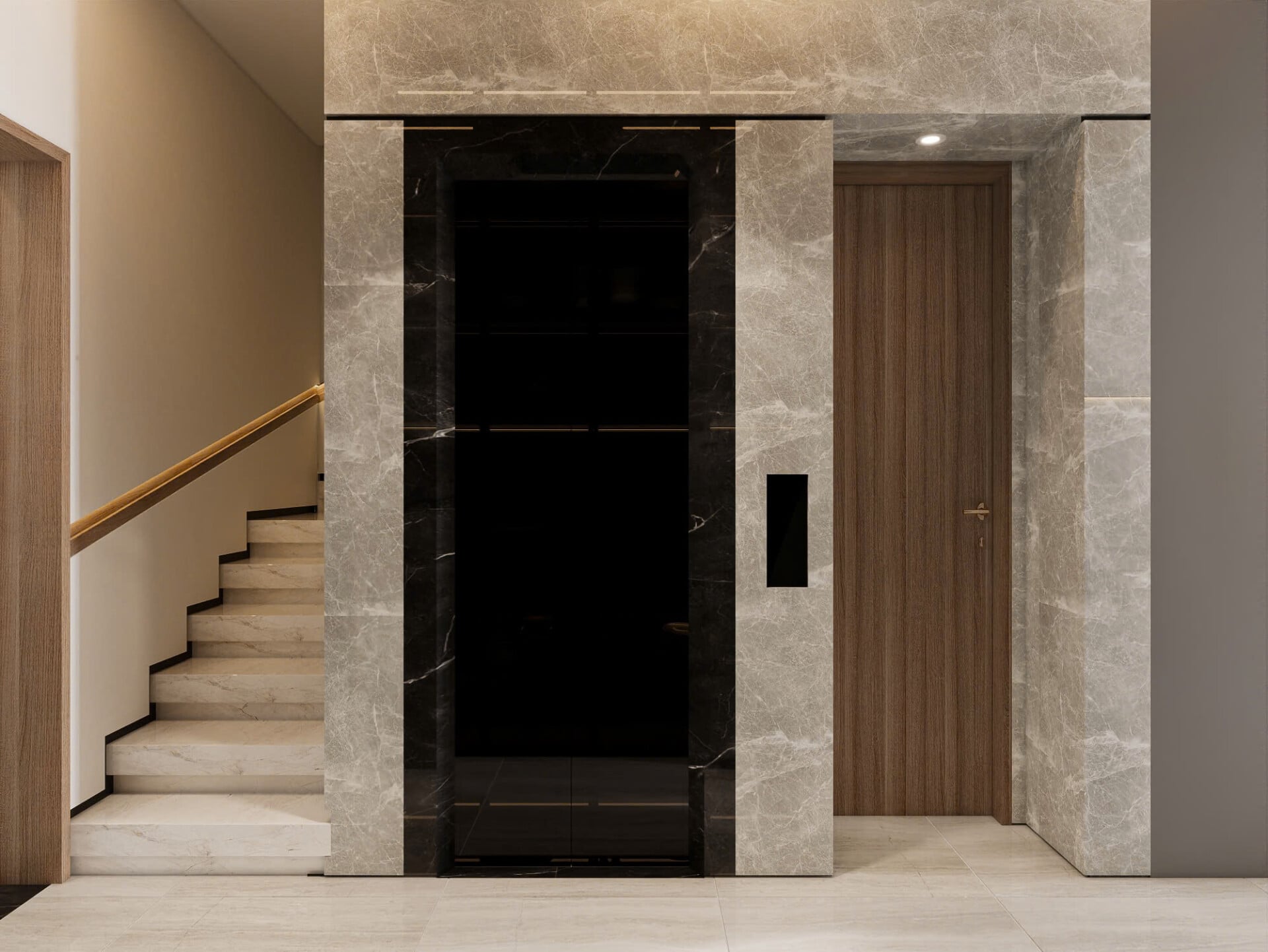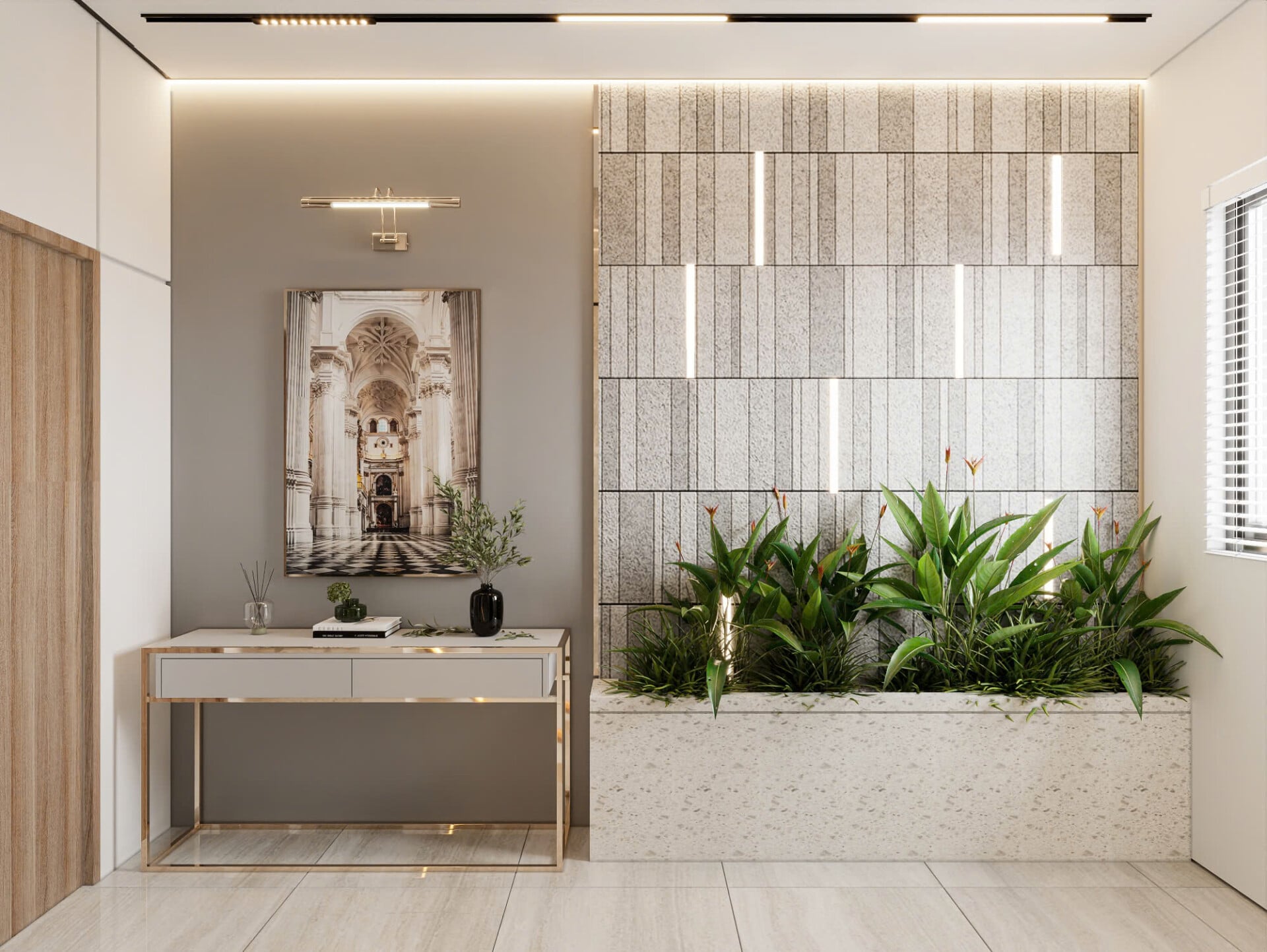 Sảnh đón gây ấn tượng với mảng tường đá vân nổi, ánh sáng line chạy dọc và bồn cây xanh giúp không gian trở nên mềm mại, sang trọng. Tiếp nối là khu sảnh chuyển tiếp, nơi console tối giản kết hợp ghế nghỉ và mảng xanh điểm xuyết tạo cảm giác thư giãn mỗi khi bước qua.