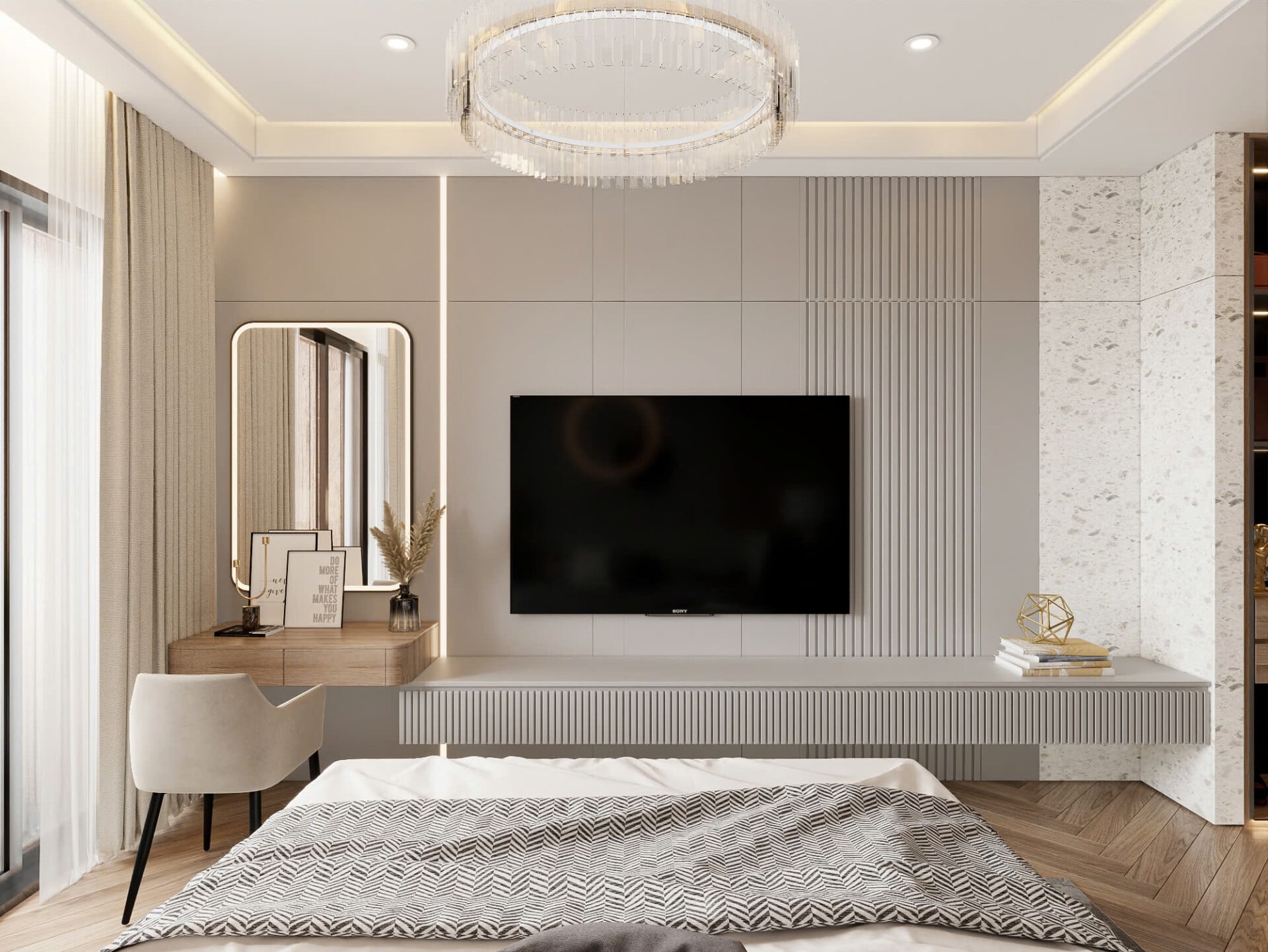 Phòng ngủ master ưu tiên sự ấm áp với gỗ ốp tường, giường bọc mềm và ánh sáng dịu ôm trọn không gian.
