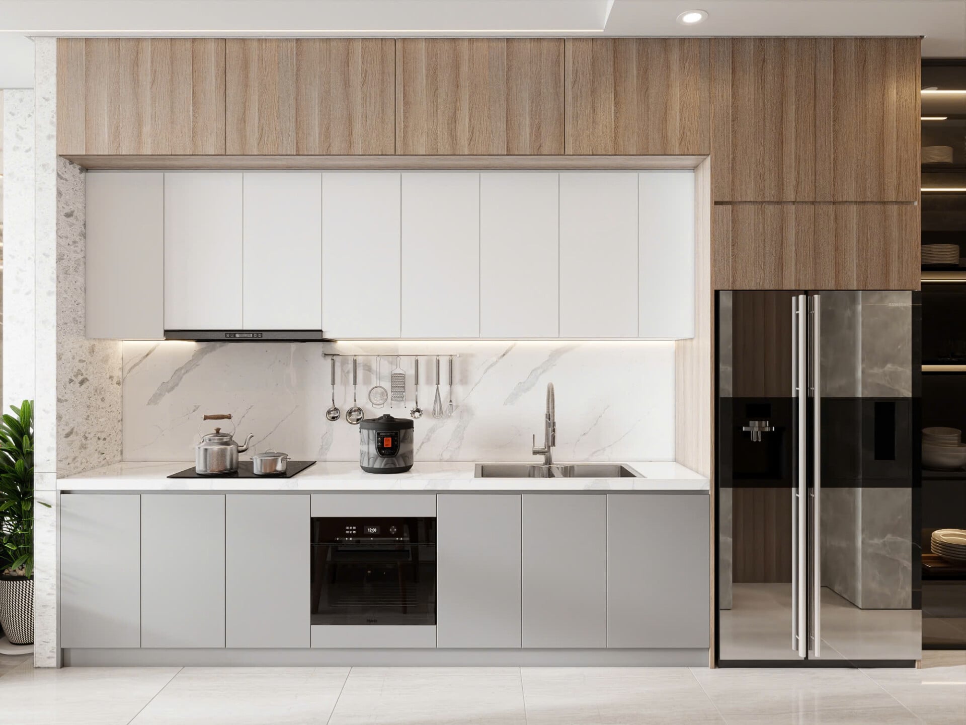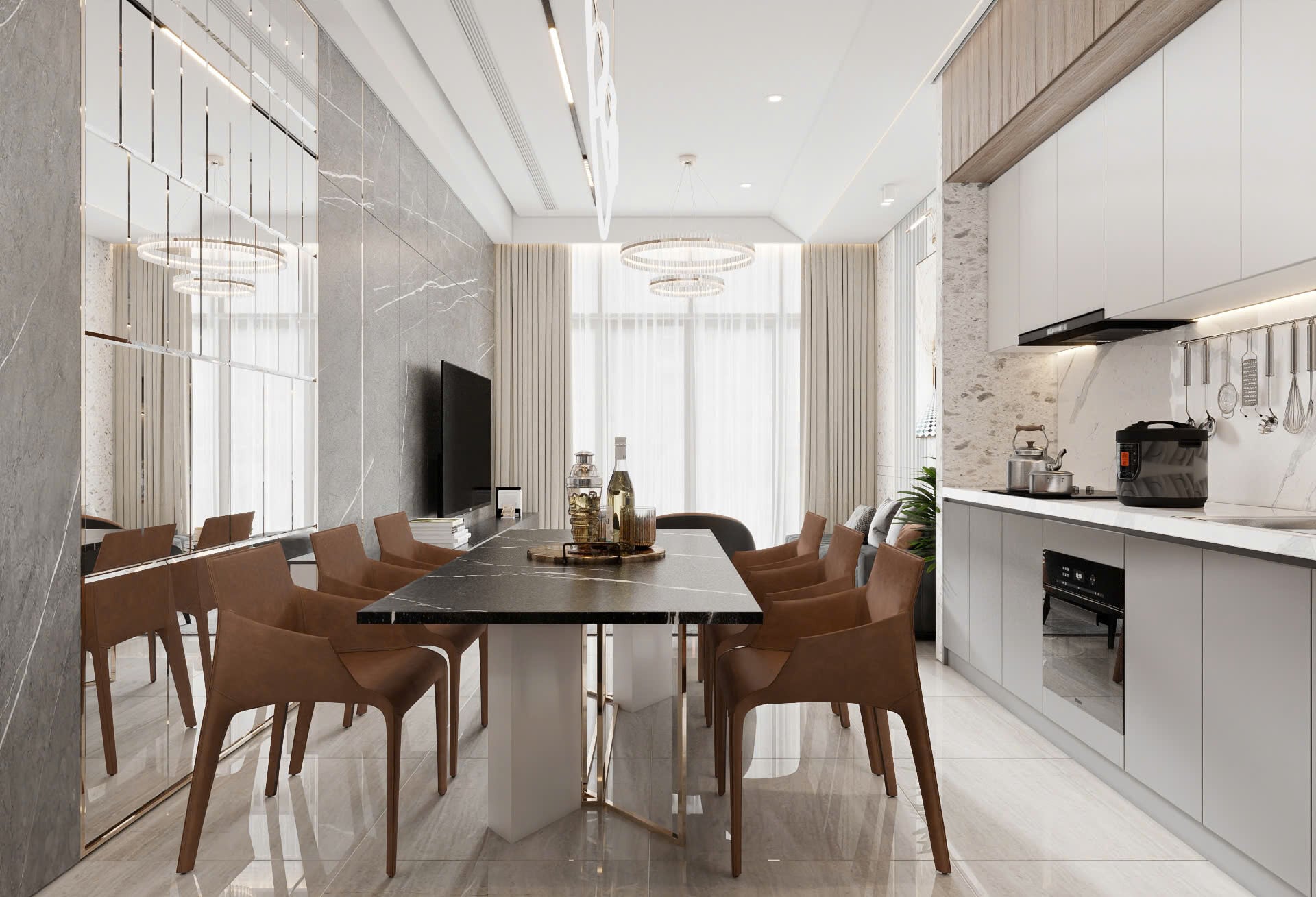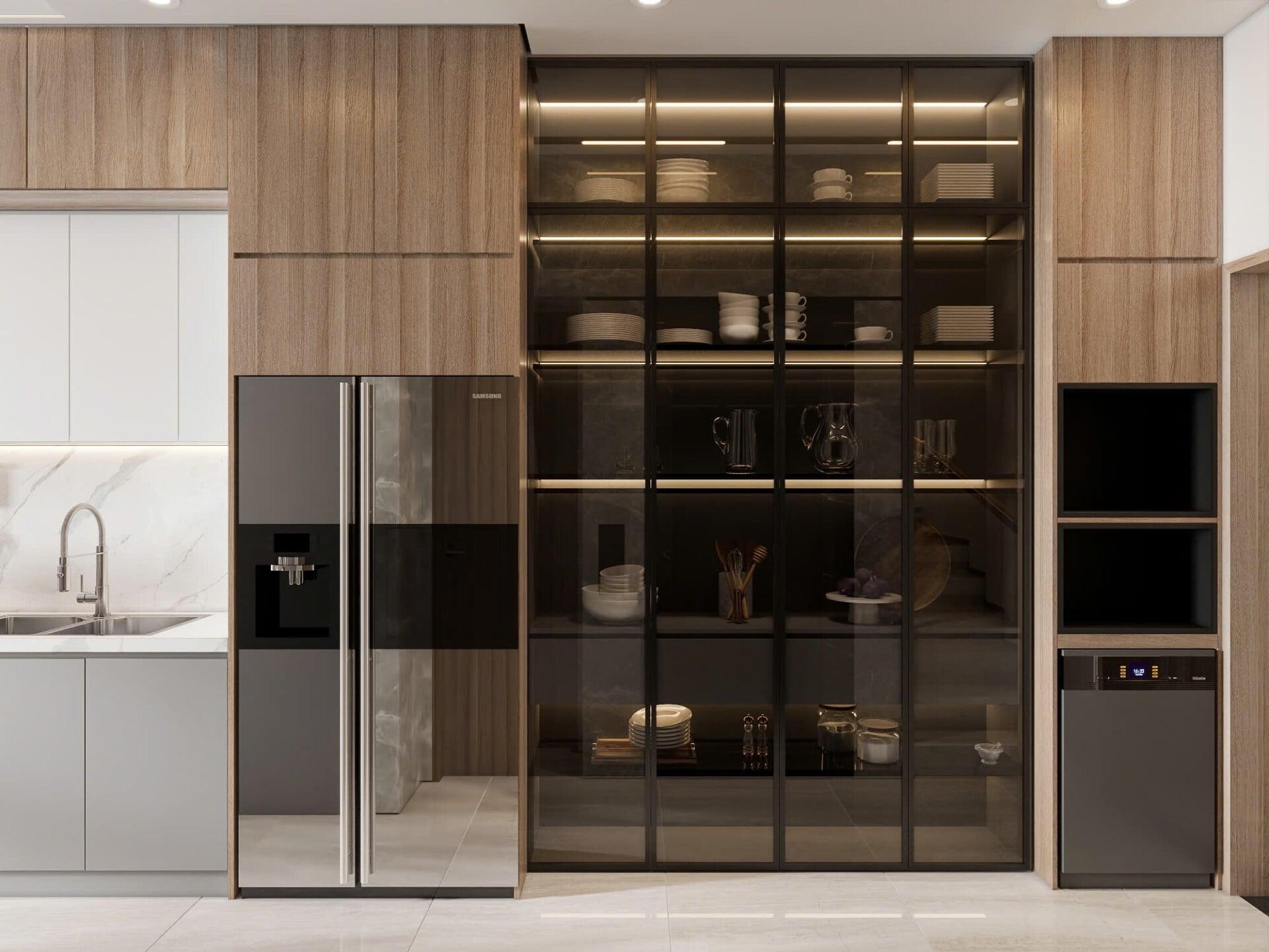 Đảo bếp và khu nấu tách biệt tạo workflow thuận tiện.