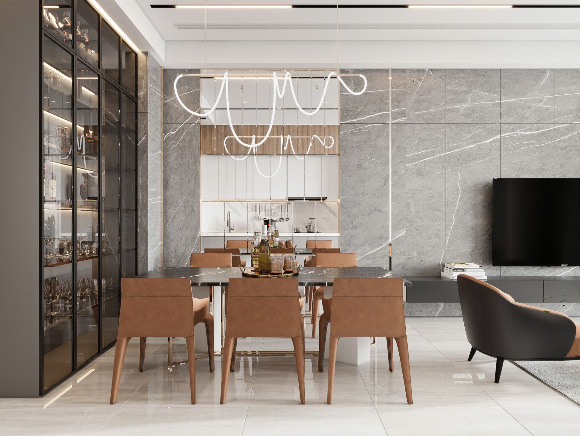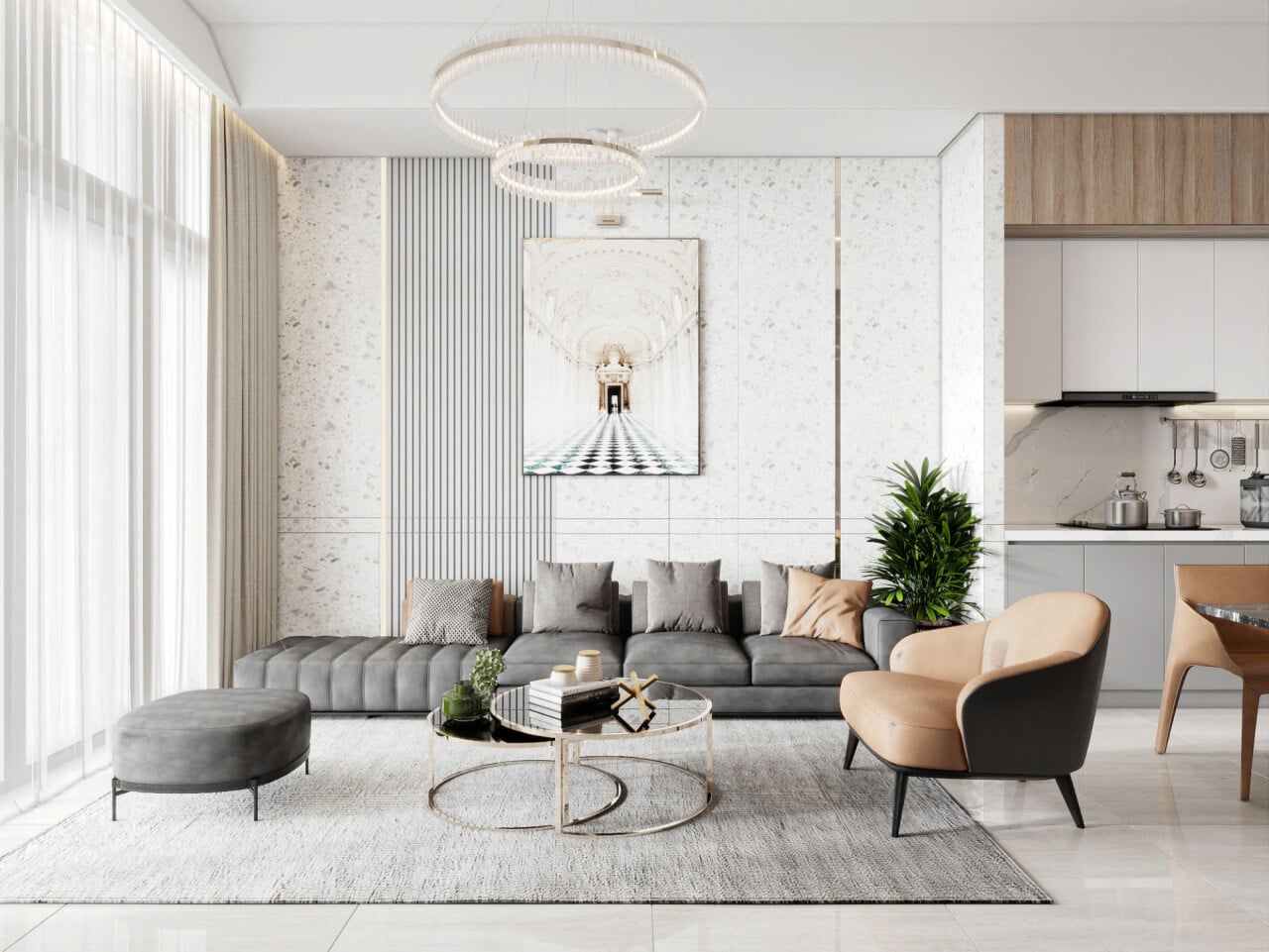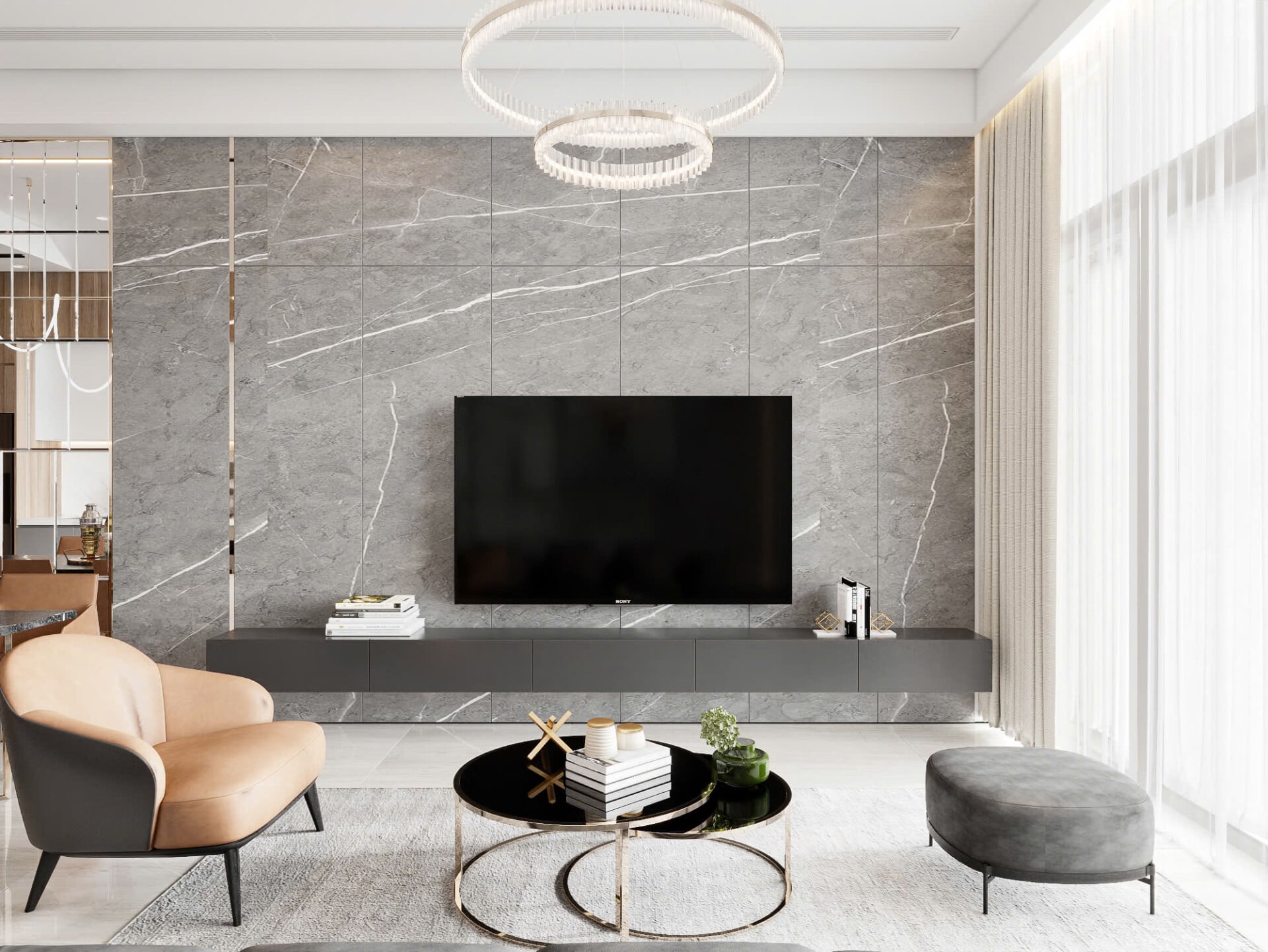 Tông màu trung tính kết hợp đá – gỗ tạo nên sự sang trọng nhưng không phô trương.