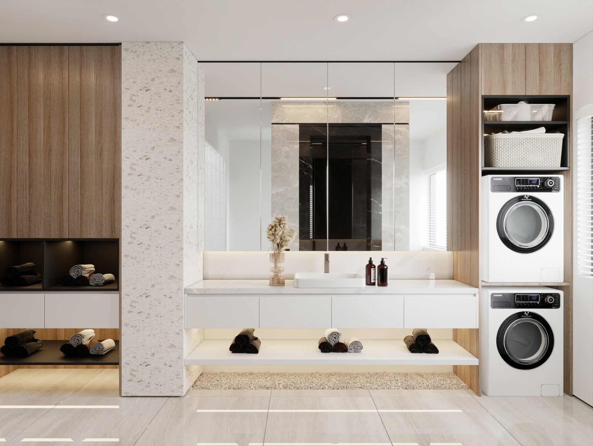 Phòng giặt sấy được thiết kế gọn gàng, tách biệt nhưng hòa vào tổng thể nhờ bảng màu sáng. Hệ tủ âm, kệ mở và bố trí máy giặt – sấy theo chiều dọc giúp tối ưu diện tích, mang đến sự thuận tiện trong sử dụng hằng ngày.