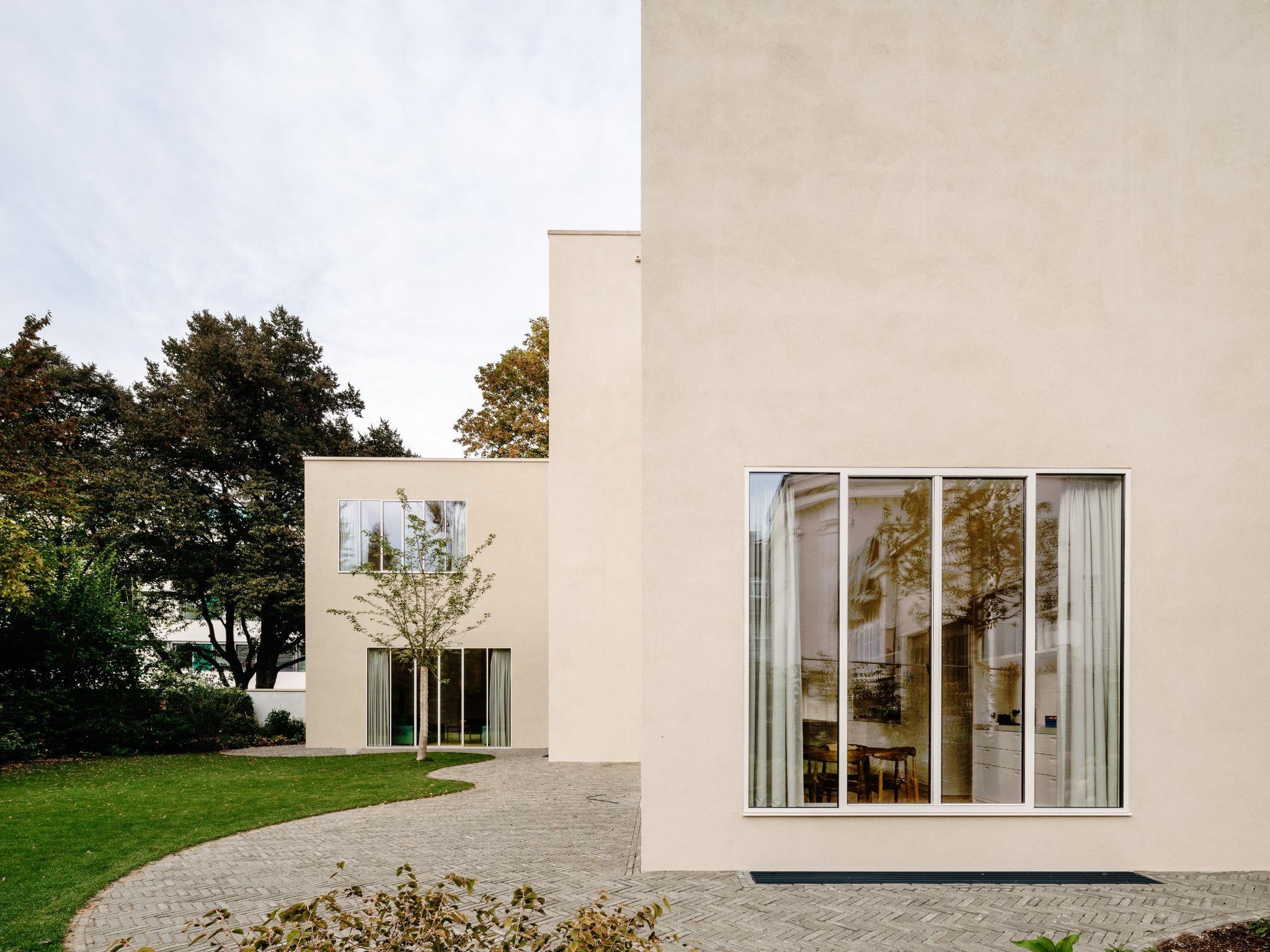 Mặt sau ngôi nhà mở trọn về vườn, các ô cửa kính cao từ sàn đến trần đón trọn ánh sáng tự nhiên. Sự tương phản giữa mặt đứng kín phố và mặt mở vườn tạo nên đặc trưng của công trình