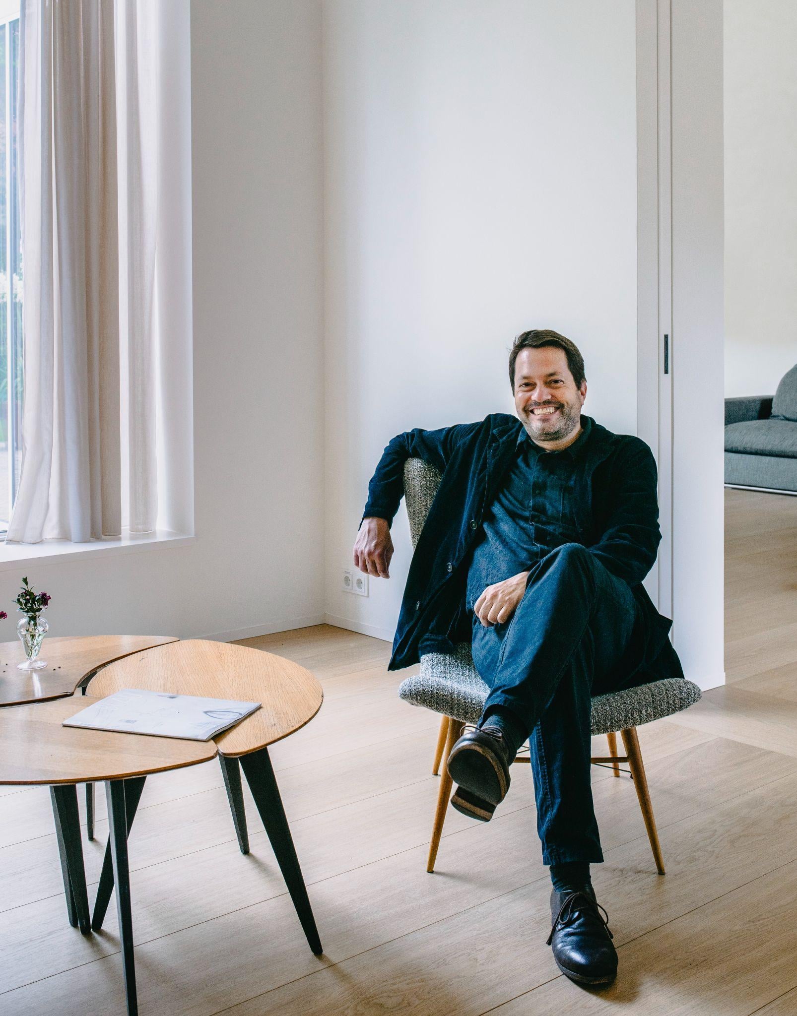 KTS Mark Randel trong không gian phòng khách của ngôi nhà do chính ông thiết kế, nơi kết hợp giữa nội thất tối giản và ánh sáng tự nhiên chan hòa. Bảng màu trung tính và chất liệu mộc mạc thể hiện triết lý “sống chậm” mà công trình hướng tới