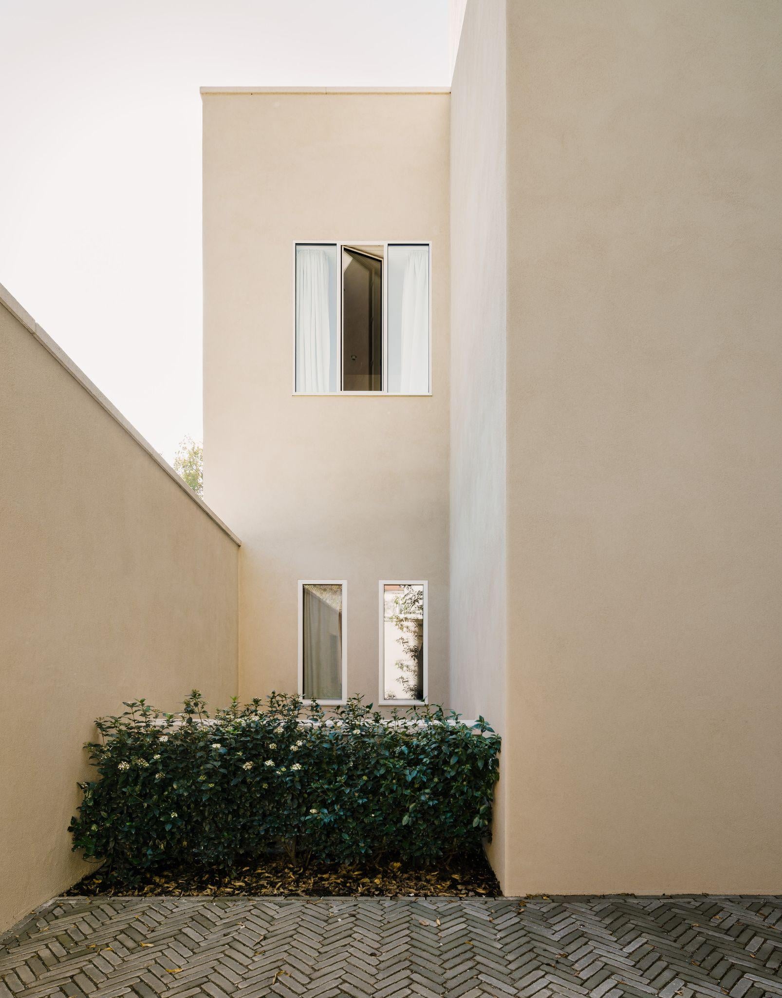 Chi tiết giao giữa hai khối nhà với các cửa sổ thẳng hàng và mảng cây xanh nhỏ ở chân tường. Cách xử lý cao độ khéo léo giúp tăng thông gió tự nhiên mà không phá vỡ tổng thể hình khối