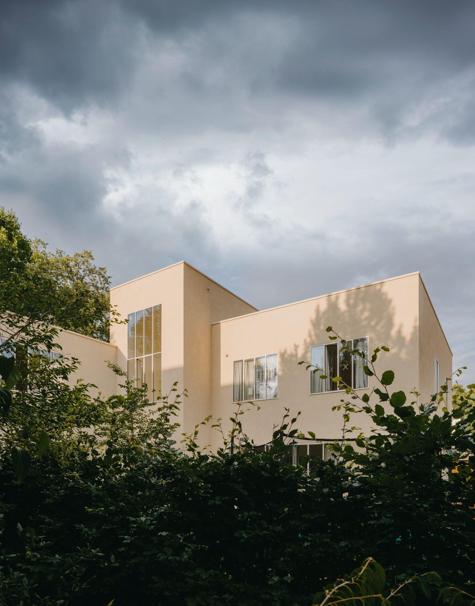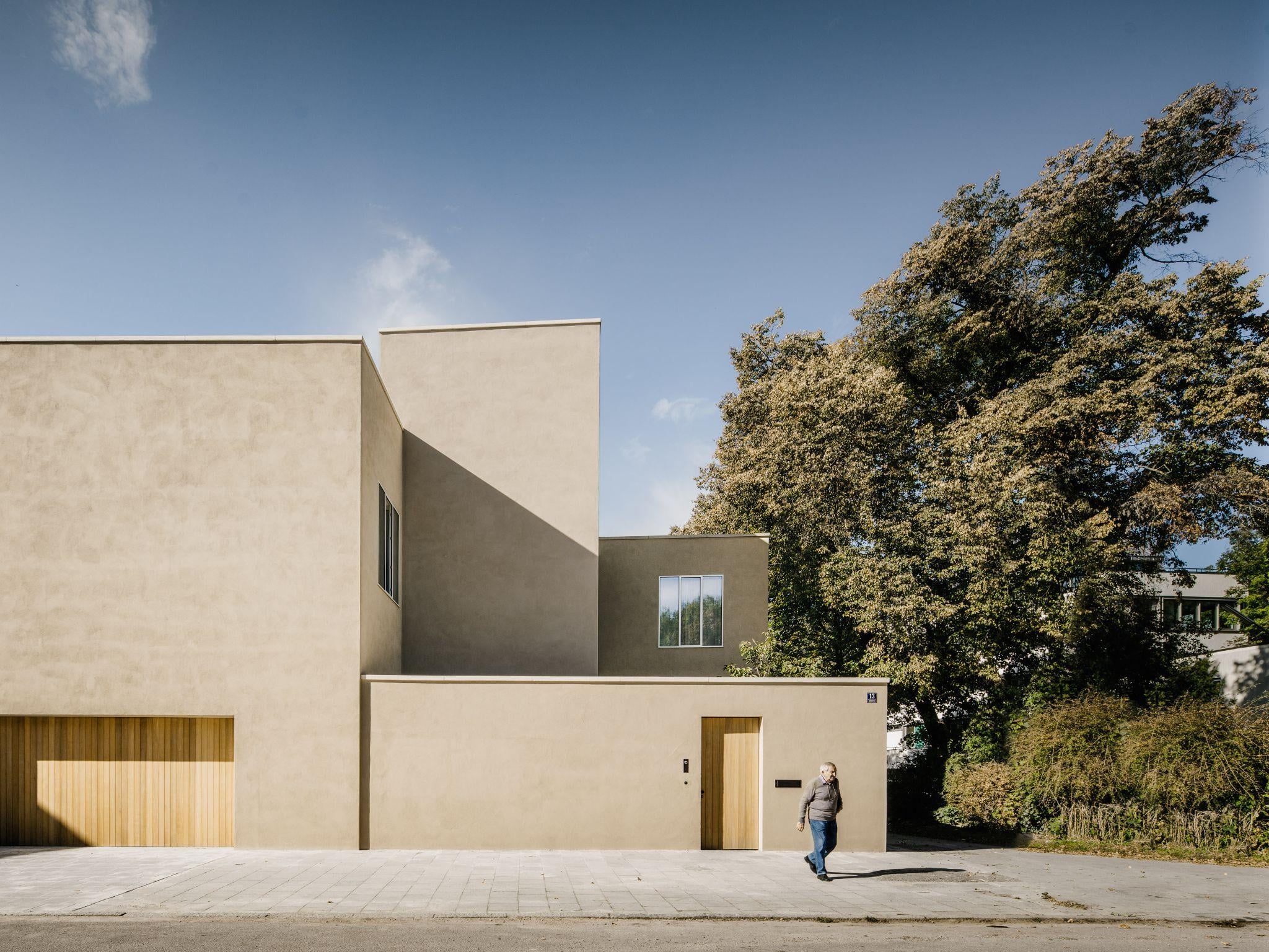 Mặt tiền ngôi nhà với ba khối hộp lệch, các mảng tường phẳng màu cát và cửa gỗ sồi tạo điểm nhấn ấm áp. Thiết kế hạn chế cửa sổ hướng phố để tăng tính riêng tư, đồng thời giữ hình khối tối giản và trầm tĩnh