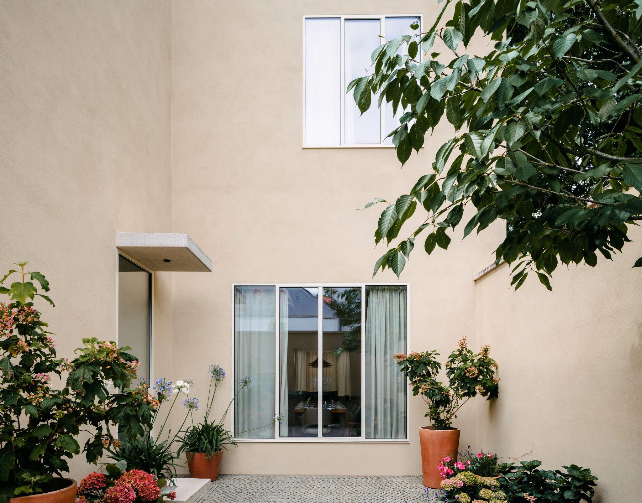 Khoảng sân nhỏ giữa các khối nhà được phủ sáng tự nhiên, điểm xuyết cây và chậu hoa mang lại cảm giác mềm mại cho không gian tối giản. Đây là lớp đệm xanh mát giúp chuyển tiếp giữa trong và ngoài, làm dịu bề mặt tường phẳng màu cát