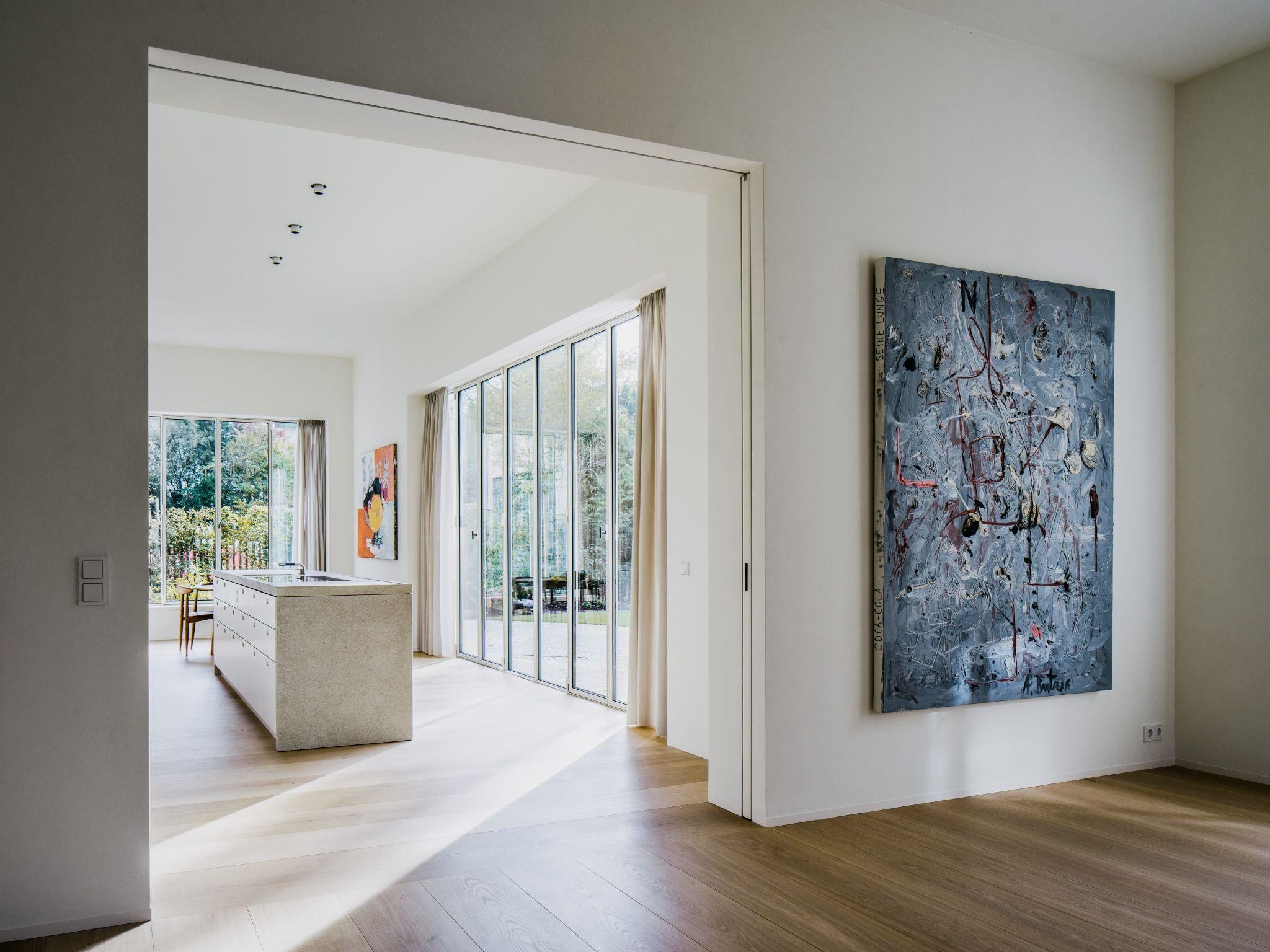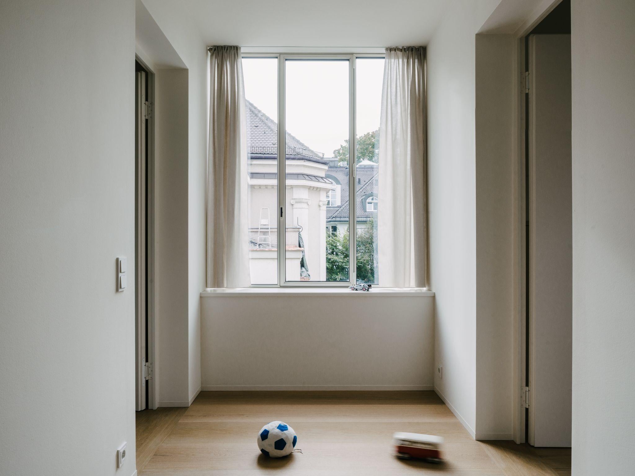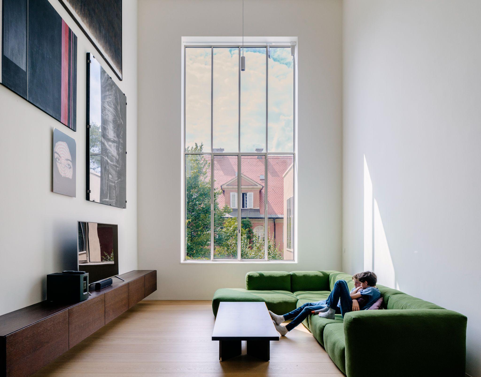 Phòng khách trần cao với khung cửa kính lớn mở ra cảnh quan phố cổ Munich. Ánh sáng chiếu sâu vào không gian kết hợp cùng nội thất tối giản tạo cảm giác thoáng đãng và thư giãn