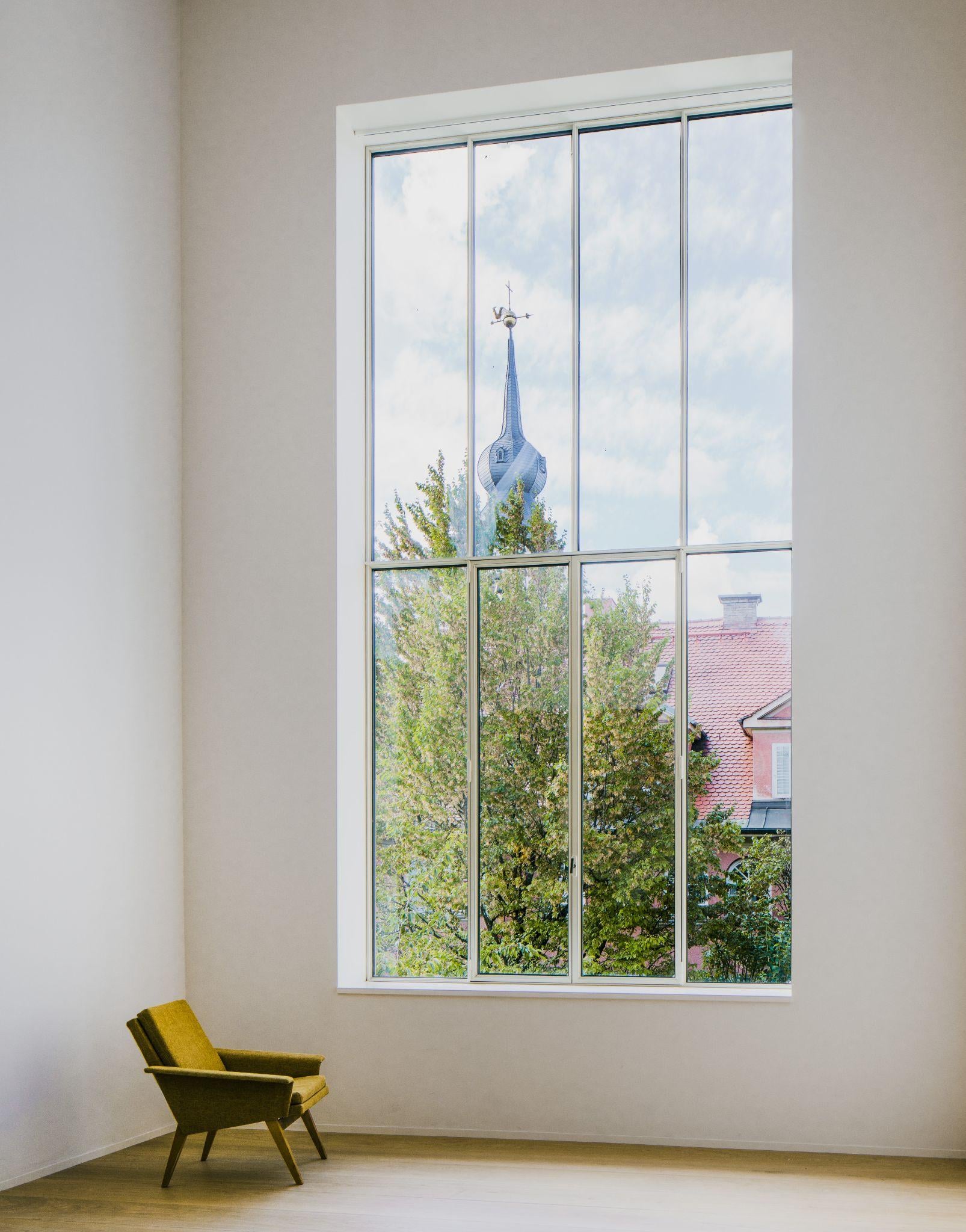 Góc phòng đơn giản chỉ với chiếc ghế đơn đặt cạnh cửa sổ cao trần nhìn ra tháp nhà thờ đối diện. Cửa sổ này là điểm “kết nối thị giác” giữa nội thất tĩnh lặng và khung cảnh đô thị bên ngoài