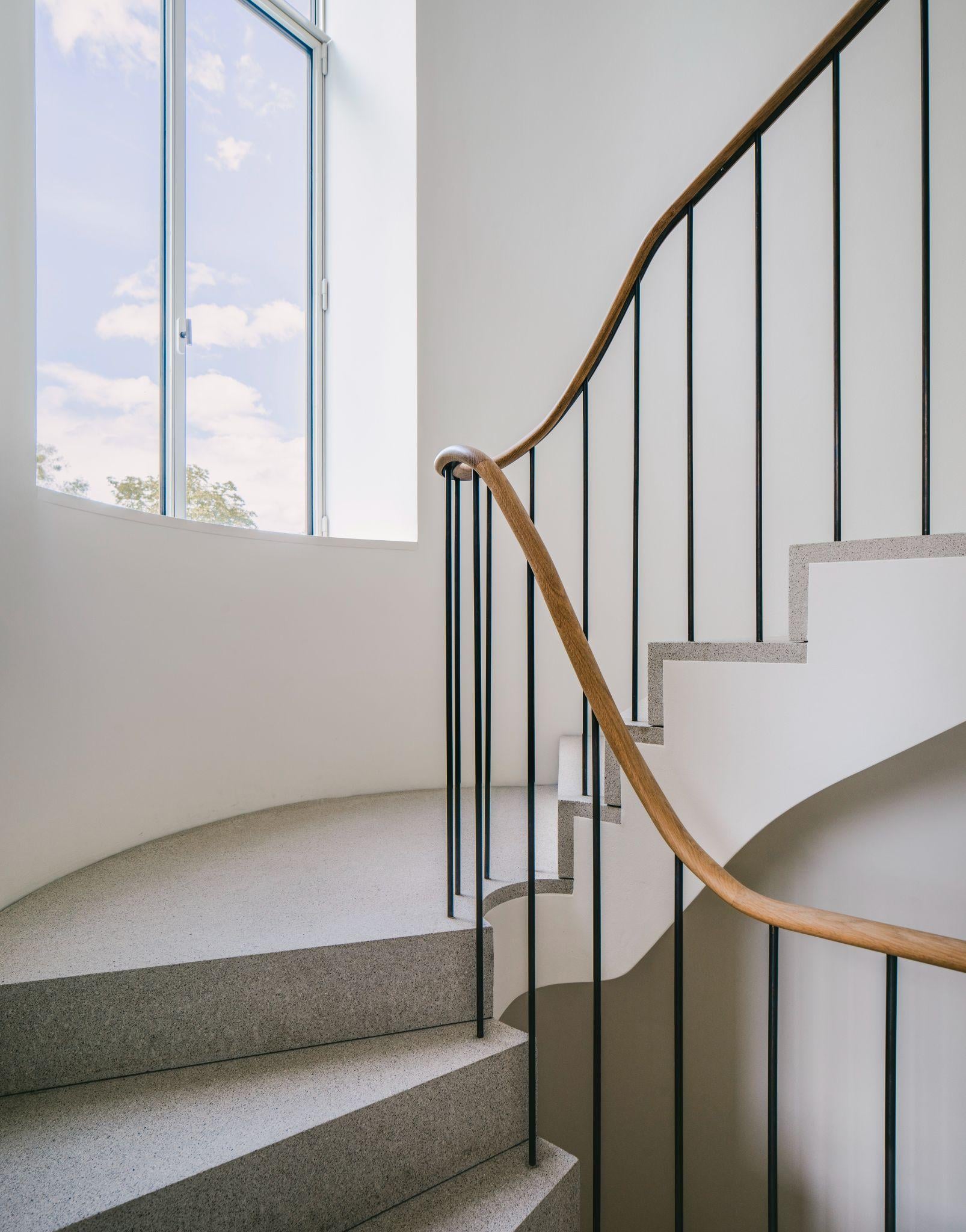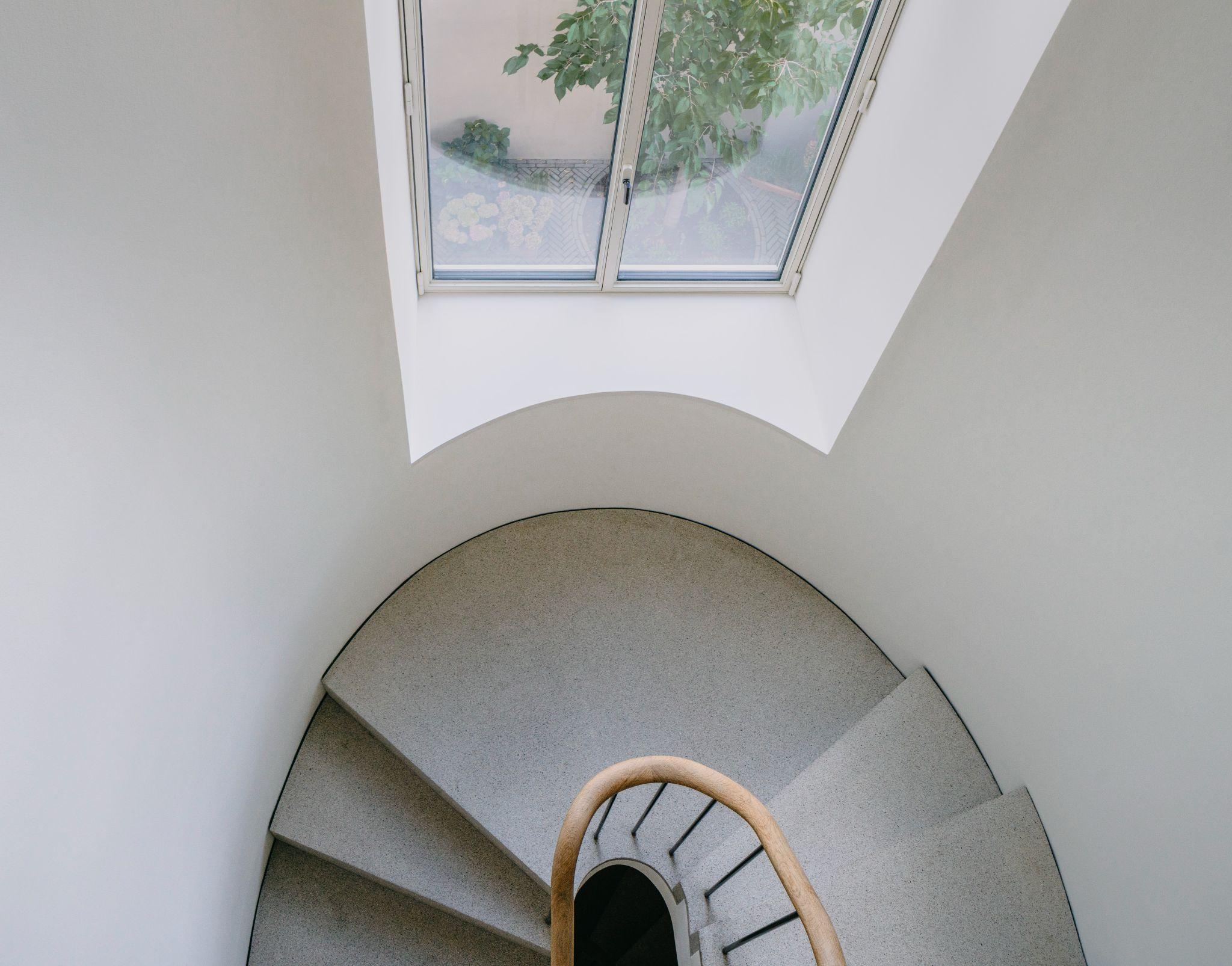 Góc nhìn từ trên cao xuống cầu thang oval cho thấy đường cong mềm mại của bậc terrazzo và tay vịn gỗ. Ô cửa kính lớn trên đầu cầu thang lấy sáng trực tiếp, khiến không gian luôn sáng và thoáng ngay cả khi không bật đèn
