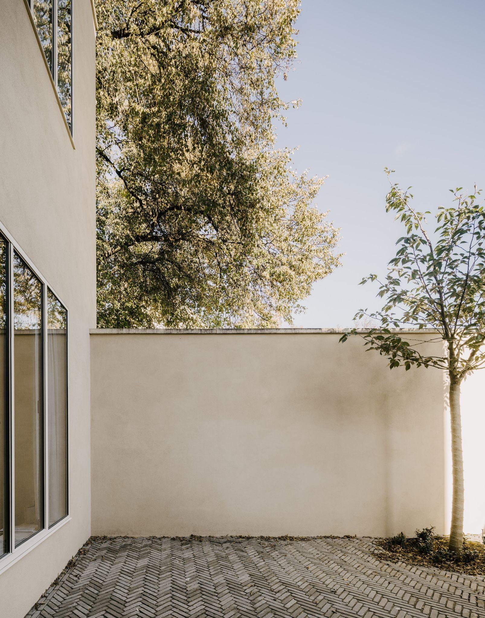 Một góc sân lát gạch xương cá và hàng cây nhỏ lọc nắng chiếu lên tường màu cát. Bố cục đơn giản nhưng cân bằng, cho thấy sự phối hợp hài hòa giữa vật liệu, ánh sáng và thiên nhiên