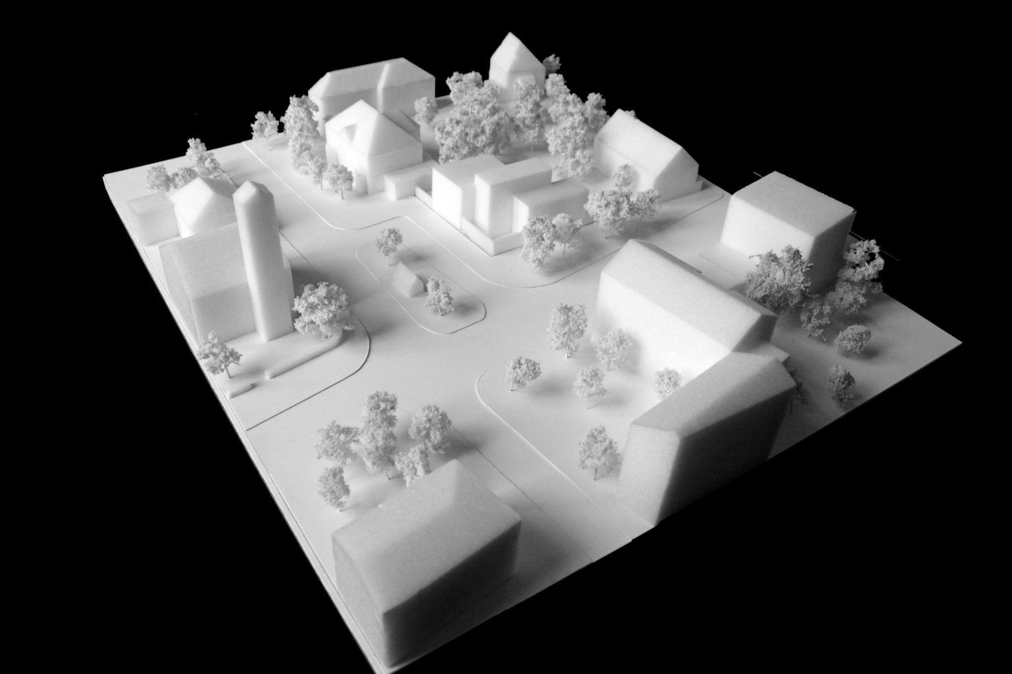 Mô hình quy hoạch khu phố với ngôi nhà nằm ở vị trí lô góc, đối diện tháp nhà thờ và quảng trường nhỏ. Cách bố trí khối nhà lệch tầng trong mô hình cho thấy sự tính toán cẩn trọng để hòa nhập bối cảnh đô thị xung quanh