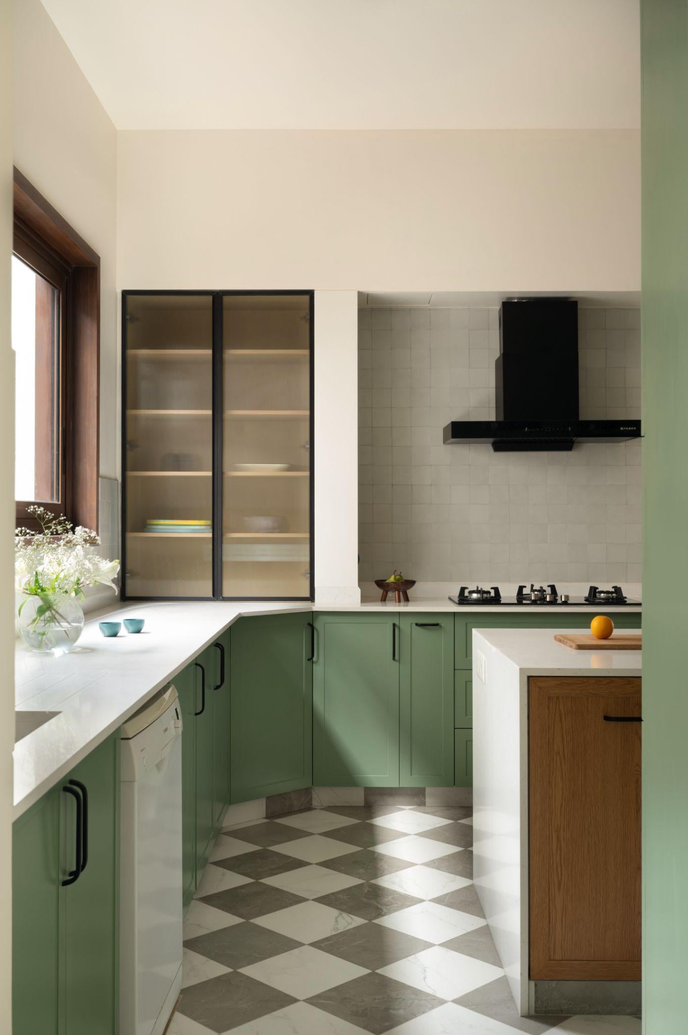 Góc bếp sáng với tủ kính khung đen, tủ dưới xanh và backsplash gạch vuông màu xám nhạt. Sự kết hợp giữa tủ kính và mặt bàn sáng giúp việc lưu trữ tiện lợi nhưng không làm không gian bị nặng nề
