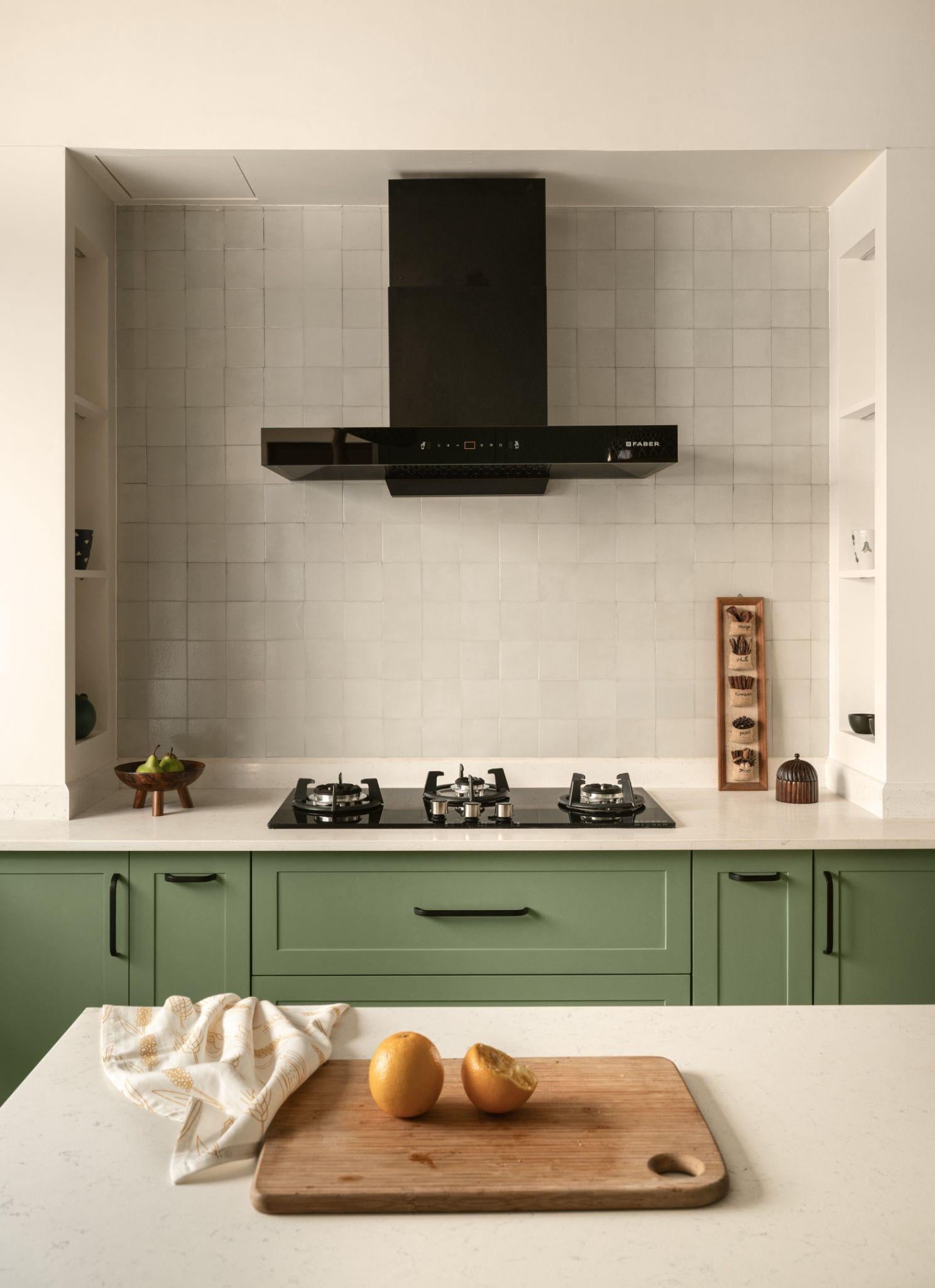 Khu vực bếp nấu với máy hút mùi màu đen nổi bật trên nền gạch vuông xám nhạt, cùng mặt bàn trắng tối giản. Thiết kế giữ mọi chi tiết gọn gàng, tận dụng tông màu tương phản để tạo điểm nhấn trong không gian bếp