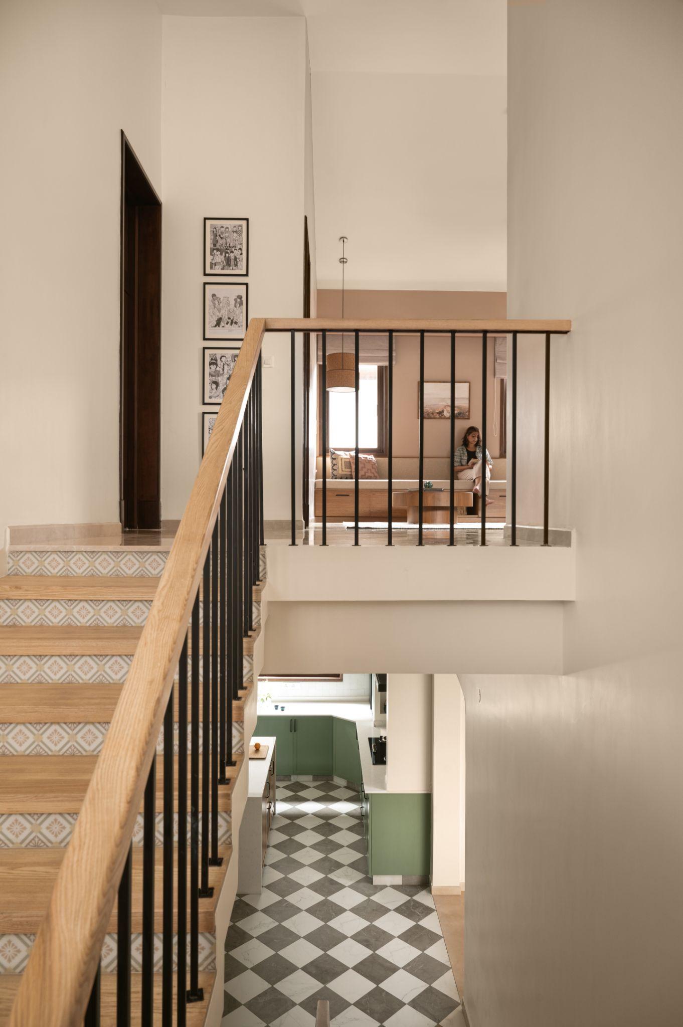 Hành lang mở nhìn xuống bếp, kết nối qua cầu thang lát gạch họa tiết và lan can kim loại đen. Cách tổ chức không gian theo trục đứng giúp ánh sáng lan tỏa đều, đồng thời tạo sự thông suốt giữa các tầng