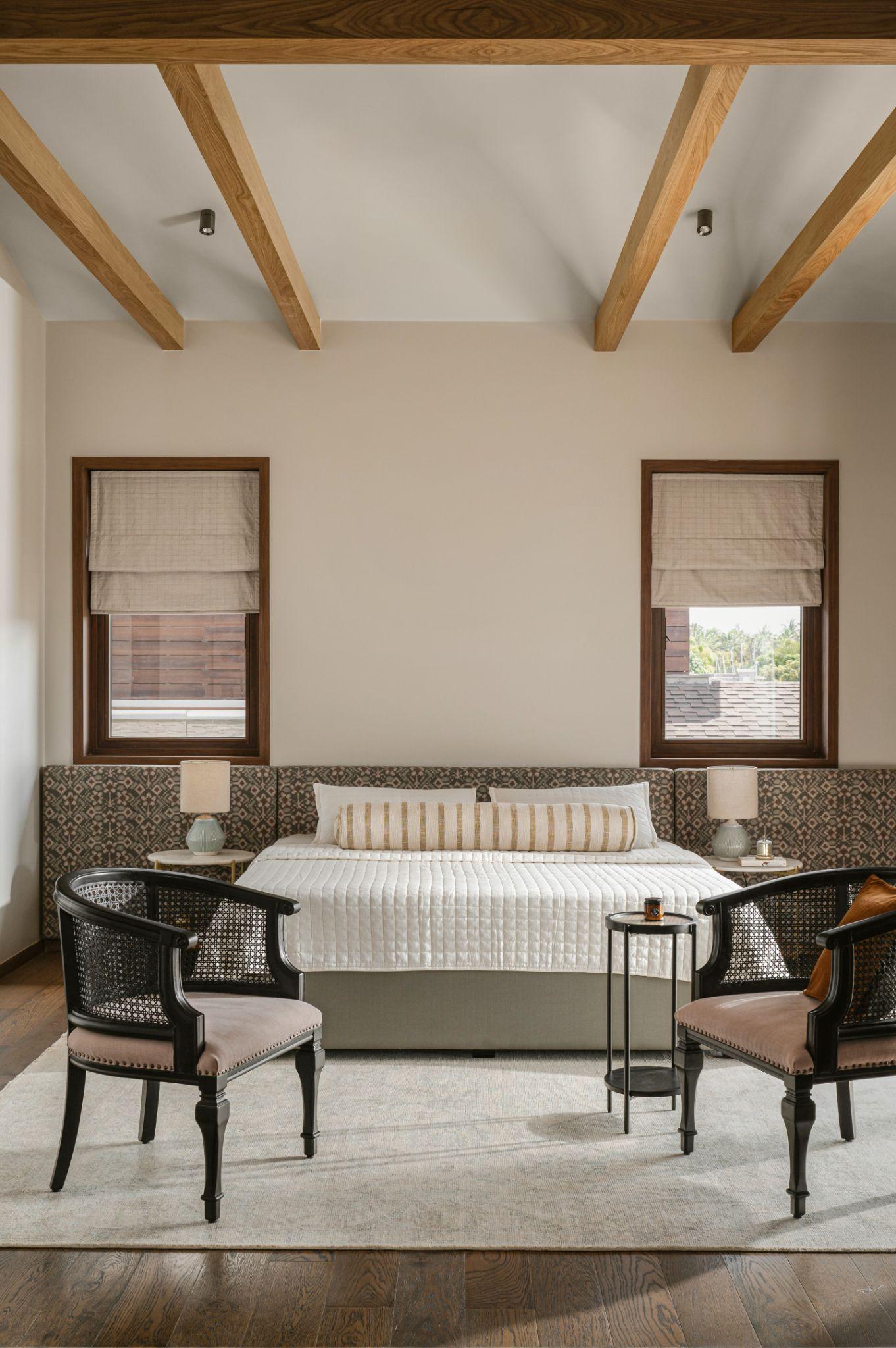 Phòng ngủ master yên tĩnh với giường lớn, ghế mây đen và trần xà gỗ tạo khung nhìn ấm áp. Kết hợp hai ô cửa sổ nhỏ và chất liệu vải tự nhiên giúp phòng sáng dịu, mang cảm giác thư giãn đặc trưng của phong cách hacienda